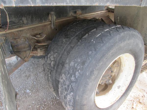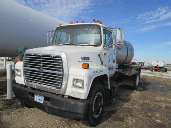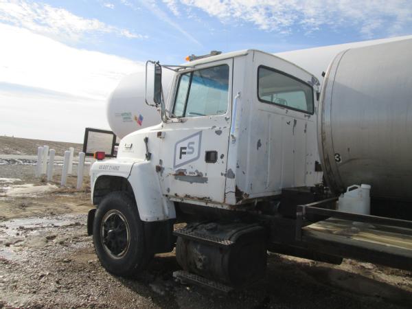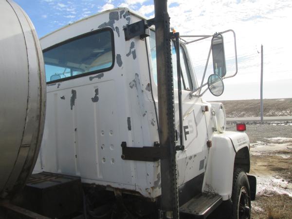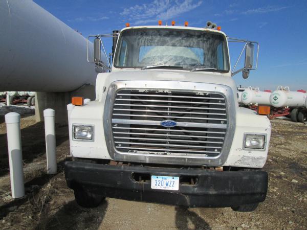 1991 Ford L8000 cab/chassis, Ford diesel engine, 5 speed transmission, 2 speed rear end, single axle, air brakes, 11R22.5 tires, Dayton wheels, shows 223,794 miles. The liquid tank in the pictures DOES NOT SELL with this truck.