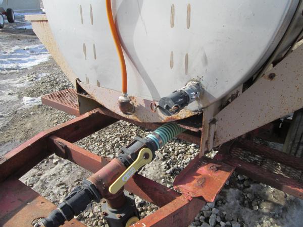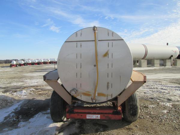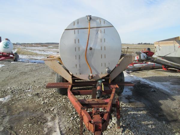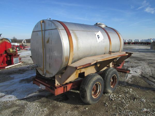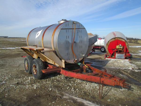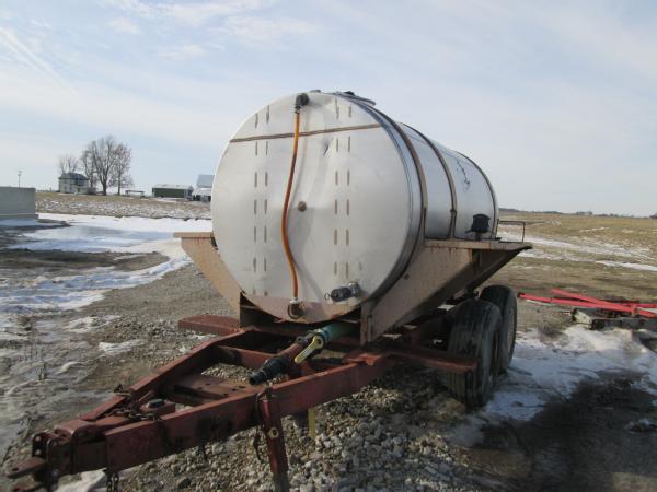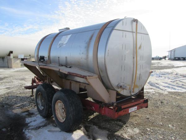 1000 gallon stainless steel liquid tank with bottom sump, tandem axle gear, 3" 2" outlet.