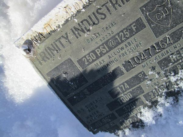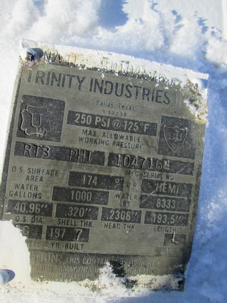 1977 Trinity 1000 gallon NH3 nurse tank (Unit 2013), top front fill, data tag, S/N 1047164, THIS LOT IS TANK ONLY.