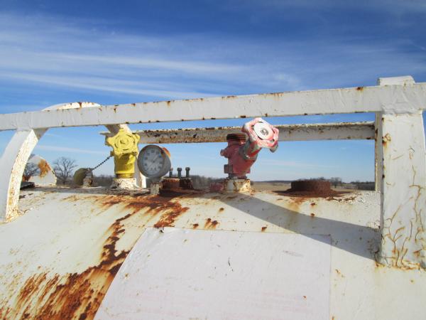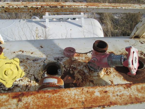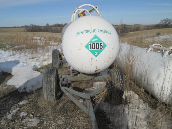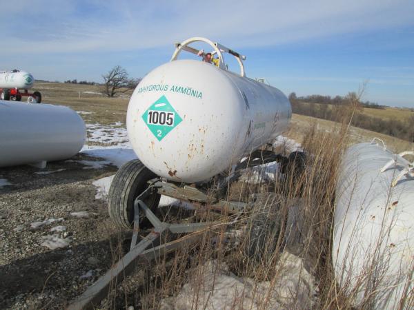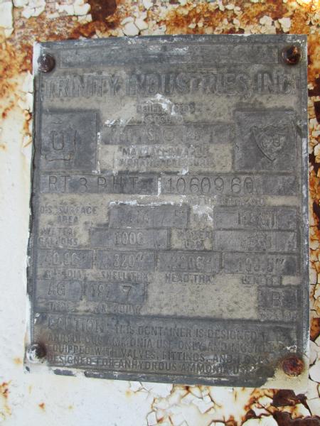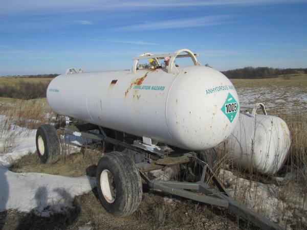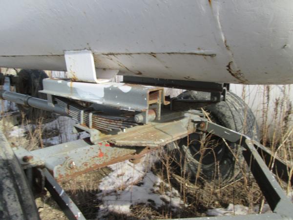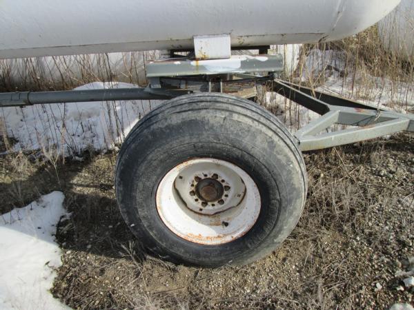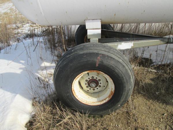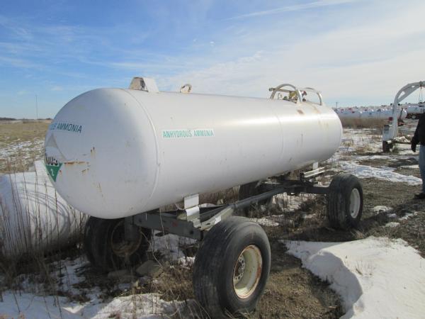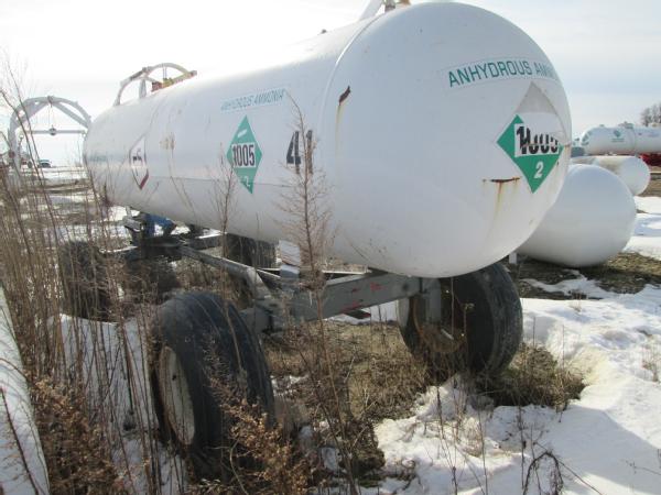 1977 Trinity 1000 gallon NH3 nurse tank, top front fill, 5th wheel running gear, data tag, 12.5-15 tires, this tank has a broken baffle.