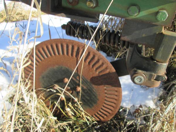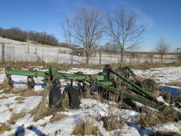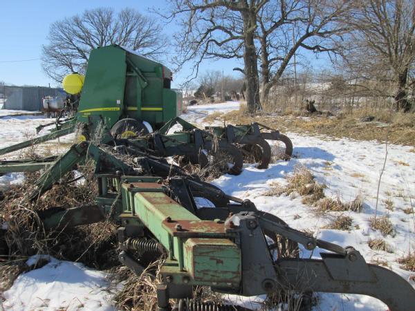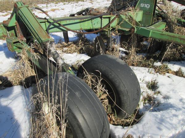 John Deere 910 ripper, 24" front ripple coulters, 9 shank, converter hitch, dual wheels.