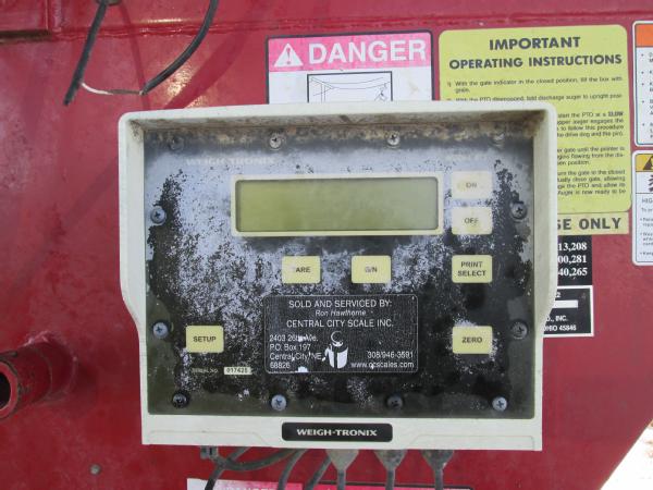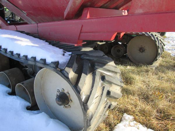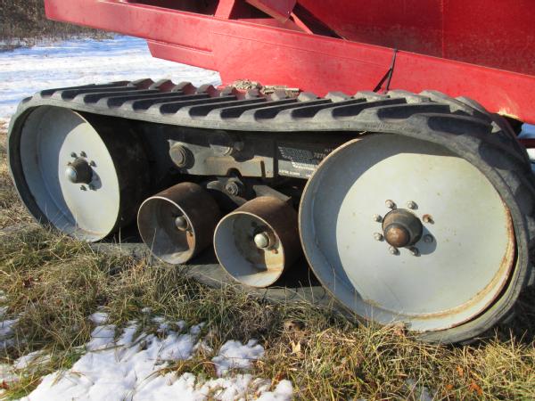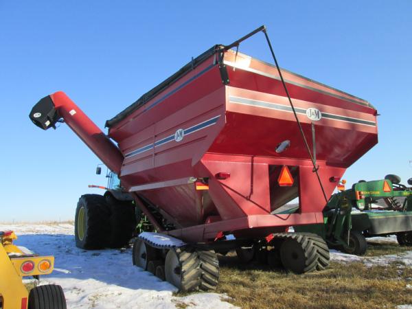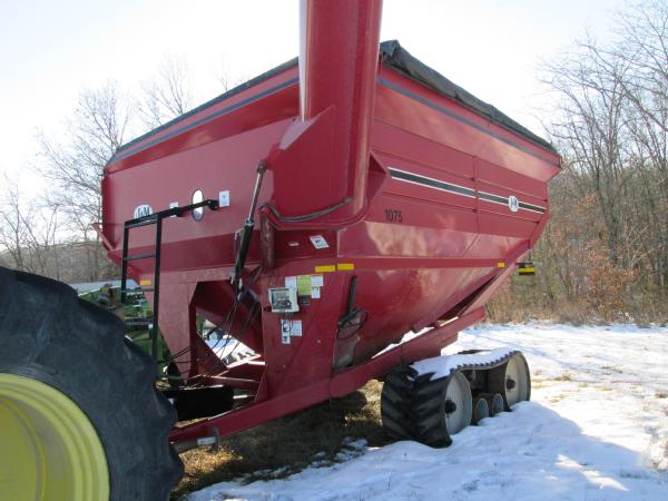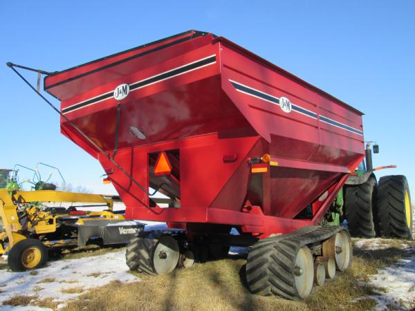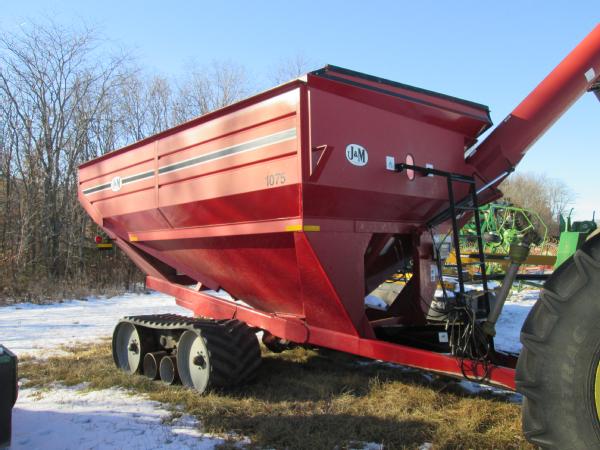 J&M 1075 grain cart, 1000 RPM PTO, roll over tarp, Weigh Tronix, digital scale, 30" Land Luvr 7070 track assemblies, left side track has been all rebuilt.