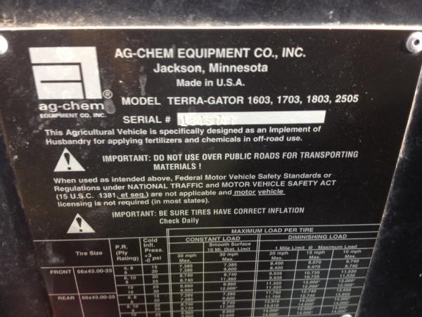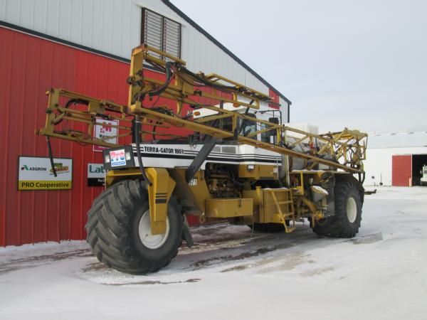1997 Terra Gator 1803, diesel engine, Terra Shift transmission, heat, air conditioning, Am/Fm radio, 1800 gallon stainless steel liquid system, 60/80' boom, foam marker, 50 gallon stainless steel foam marker tank, poly rinse tank, stainless steel chemical inductor, Mid Tech ARC 6000 monitor, shows 2863 hours.