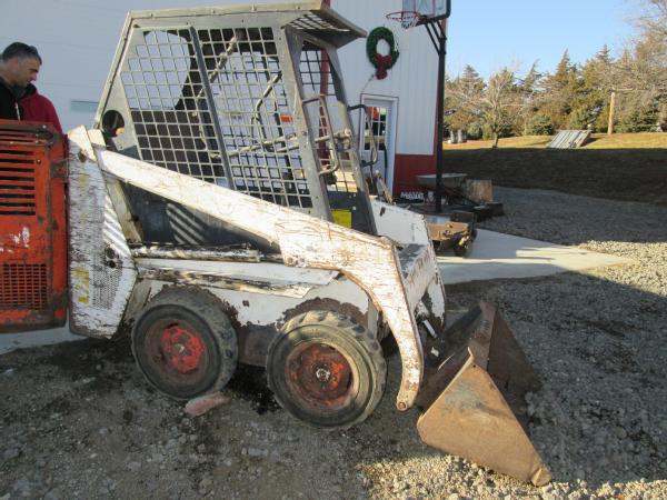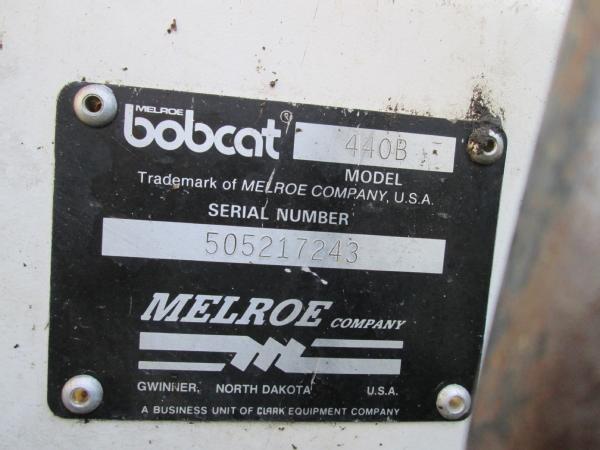 Melroe Bobcat 440B skid steer, Onan gas engine, hydrostatic drive, OROPS, 36" bucket, 5.70-12 tires, shows 2303 hours.