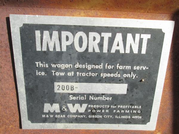 M&W model 200B gravity wagon, 10 ton gear, 10.00-15 tires.