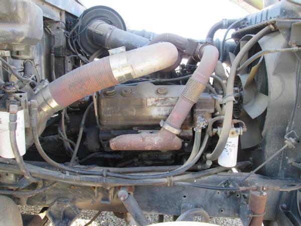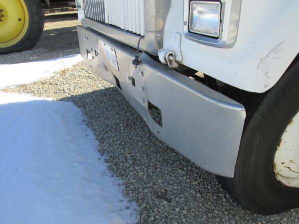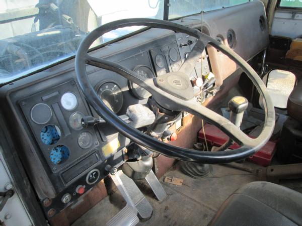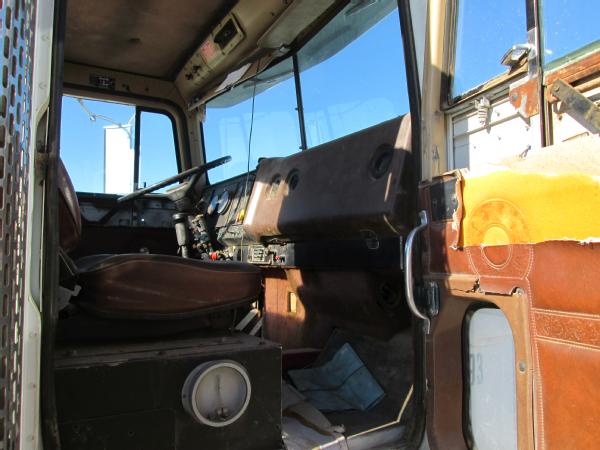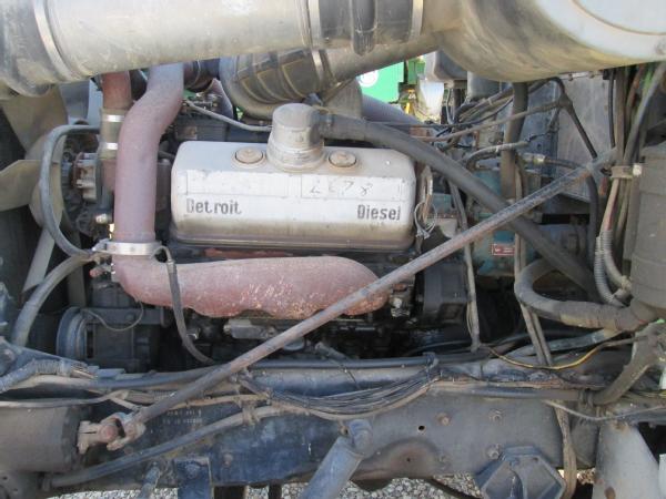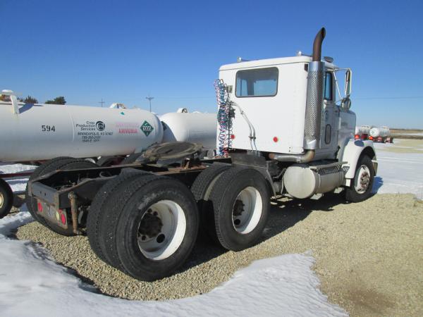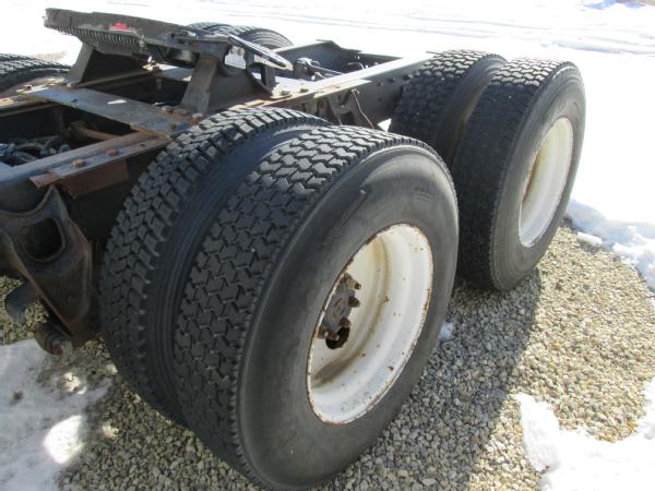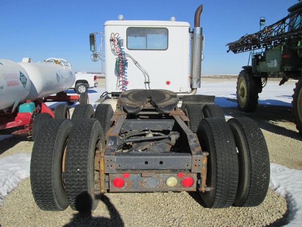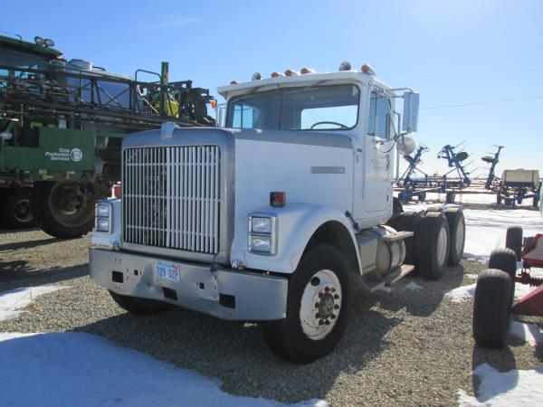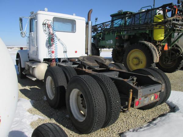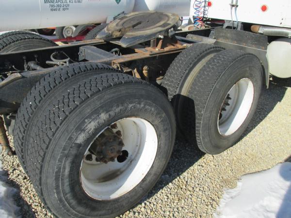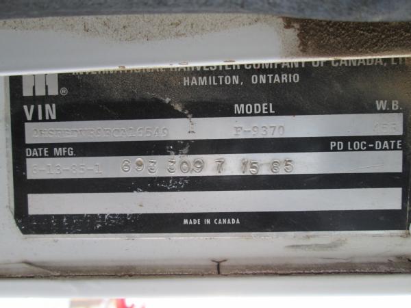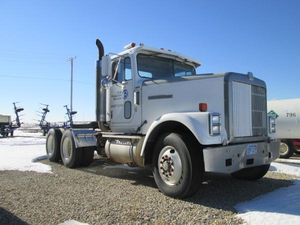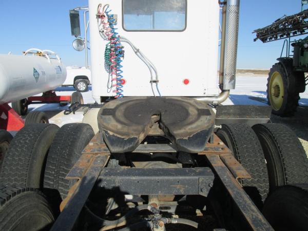 1985 International 9370 day cab (Unit 12040), Detroit diesel engine, 9 speed transmission, heat, air conditioning, Am/Fm cassette radio, air brakes, air ride suspension, tandem axle, full screw, dual aluminum fuel tanks, engine brake, 5th wheel plate, single exhaust, differential lock, 11R22.5 tires, Budd wheels, shows 525,774 miles.