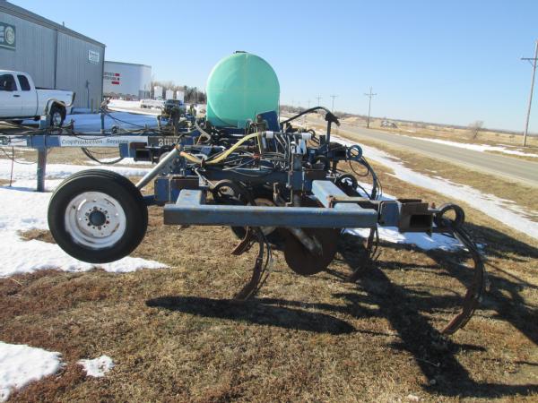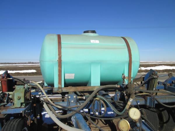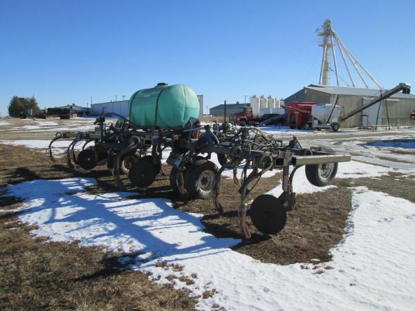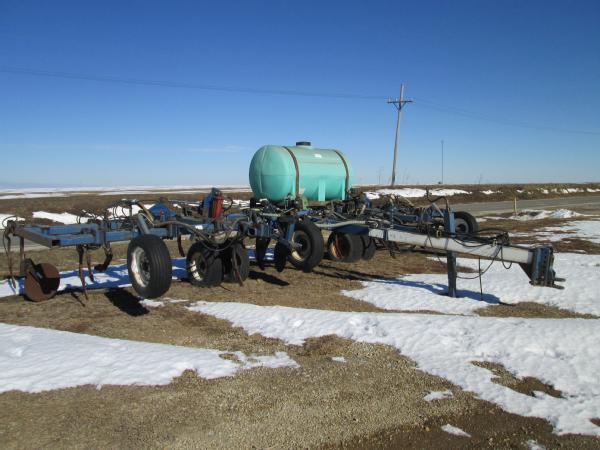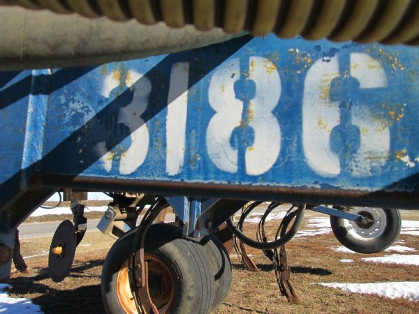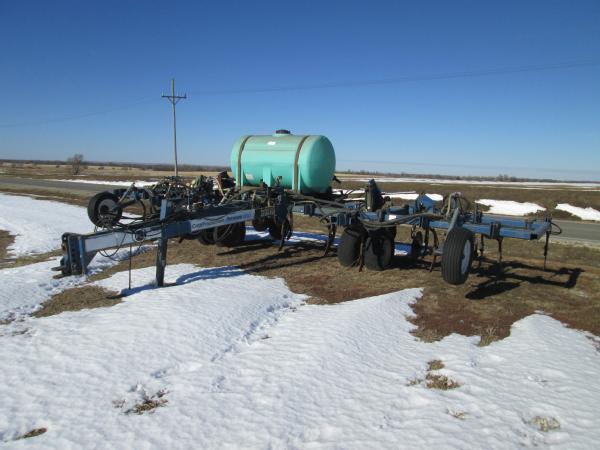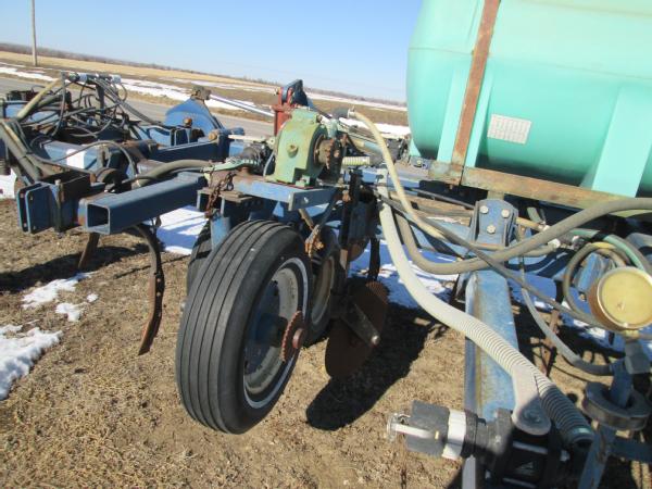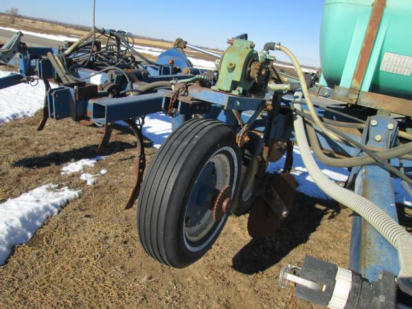 Blu-Jet 19 knife pull type liquid applicator (Unit 3186), 32', hydraulic wings, manual gauge wheels, dual main frame wheels, 500 gallon poly liquid tank, ground drive liquid pump, front coulters.