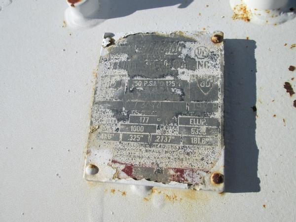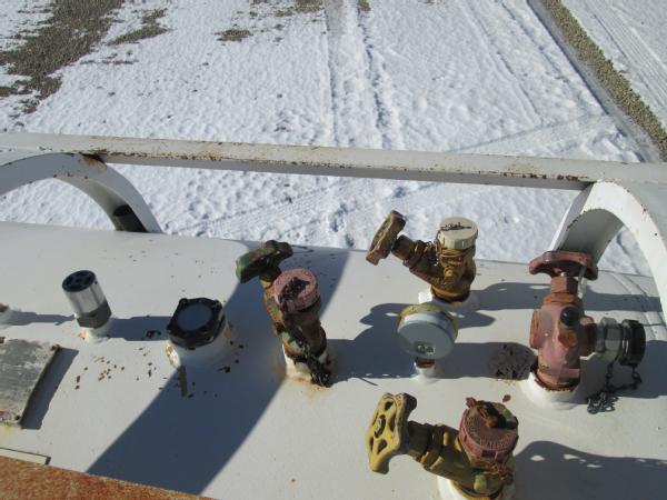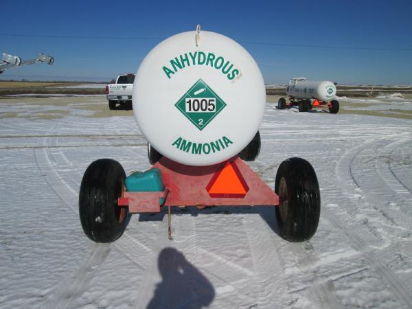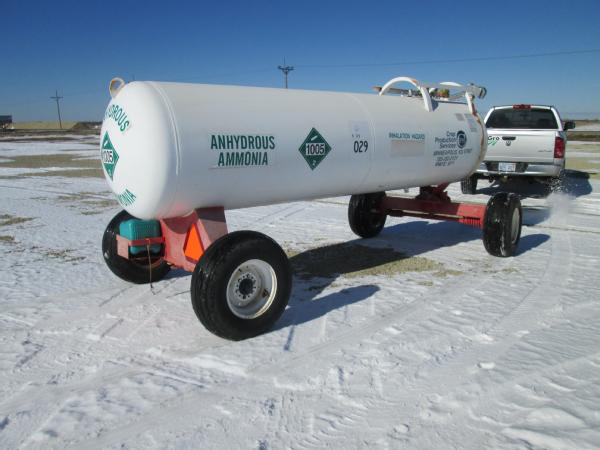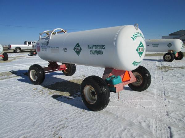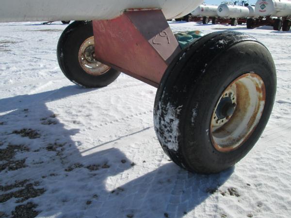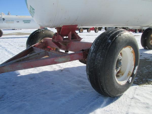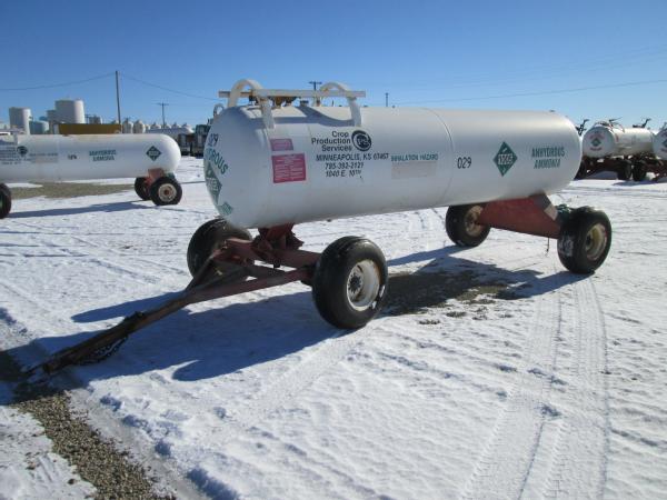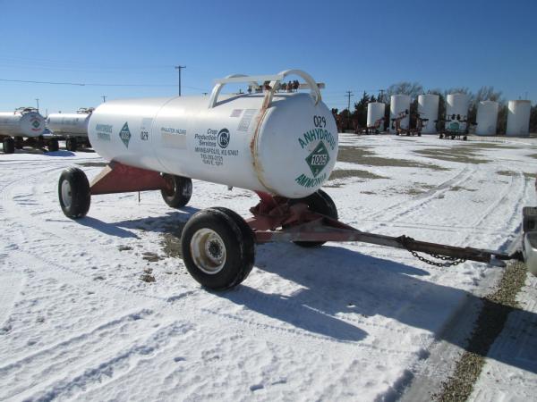 Trinity Steel Co., Inc. 1,000 gallon anhydrous nurse tank (Unit 029), top front fill, 5th wheel running gear, 11L-15 tires, data plate.