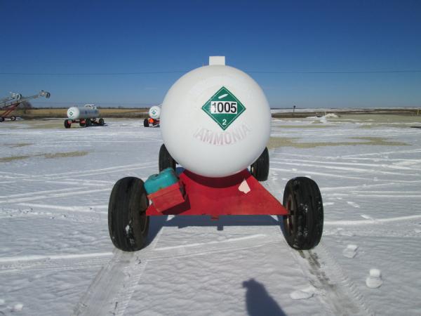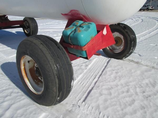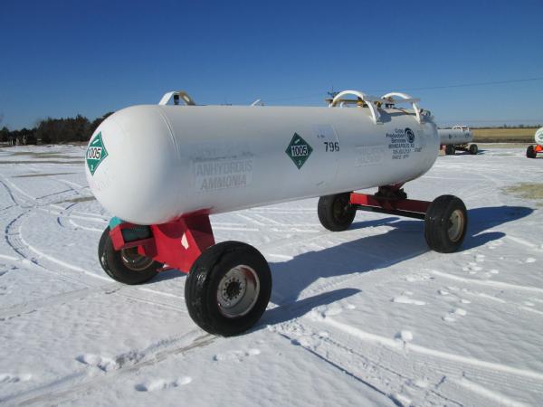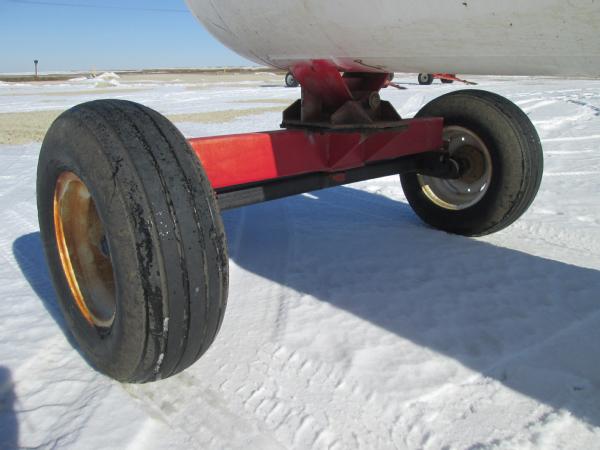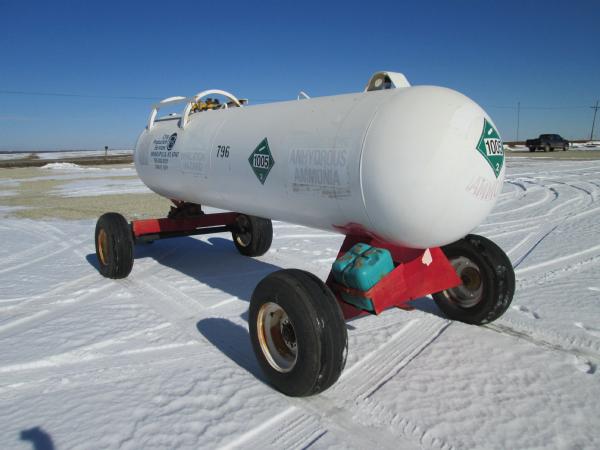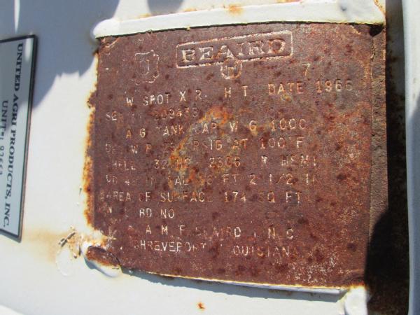 1966 Beaird 1,000 gallon anhydrous nurse tank (Unit 796), top front fill, 5th wheel running gear, 11L-15 tires, data plate.
