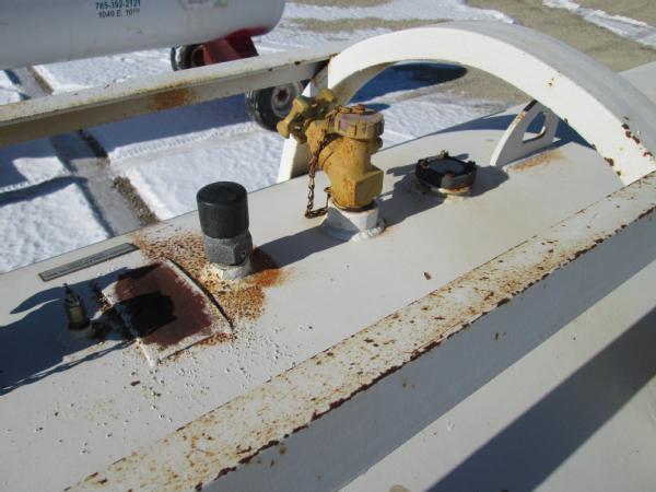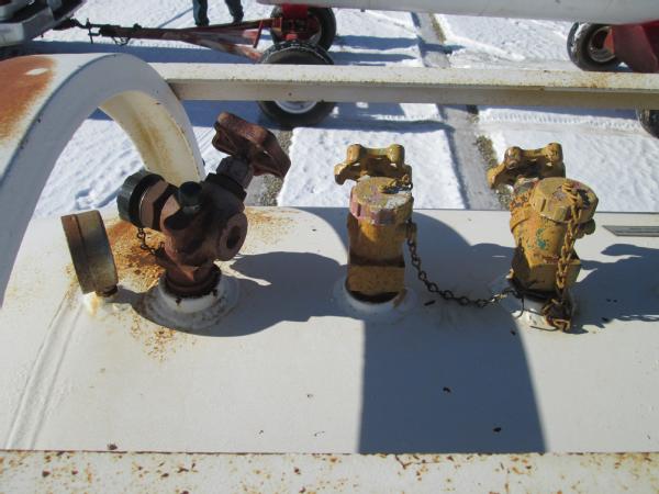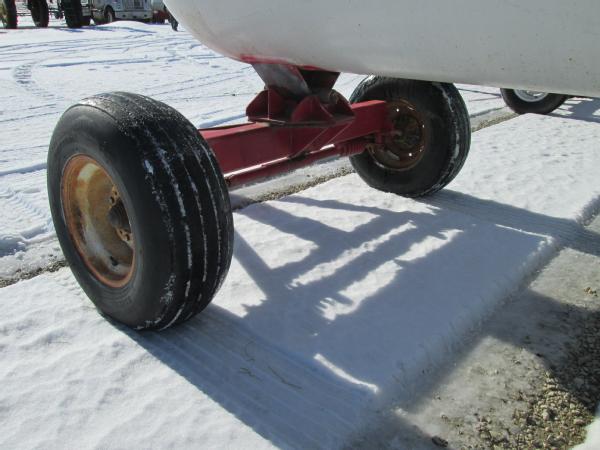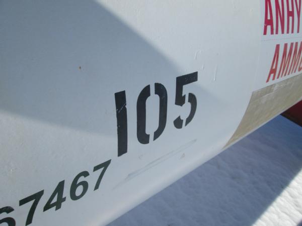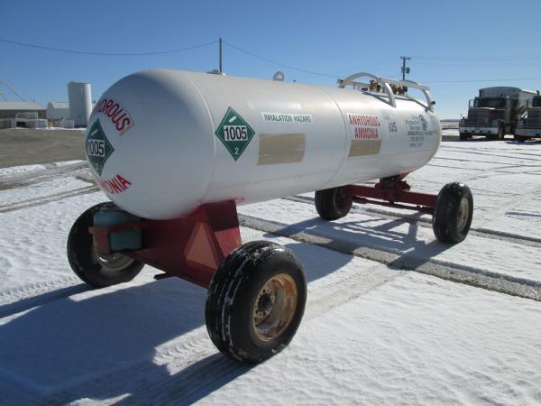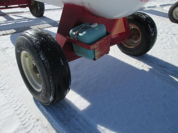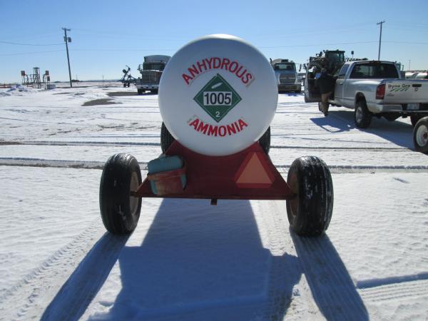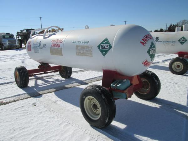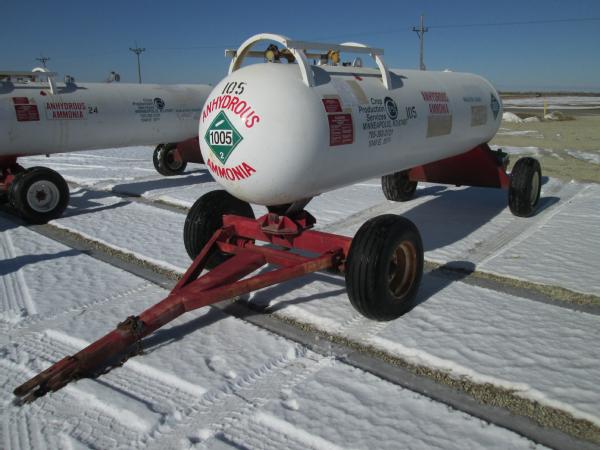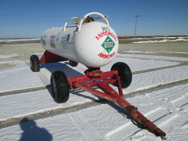 1963 1,000 gallon anhydrous nurse tank (Unit 105), top front fill, 5th wheel running gear, 11L-15 tires, data plate.