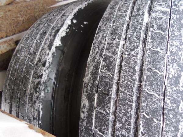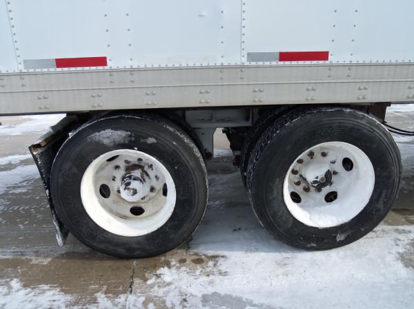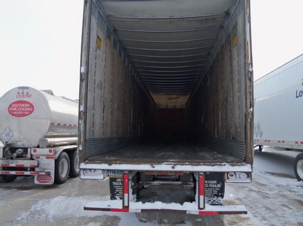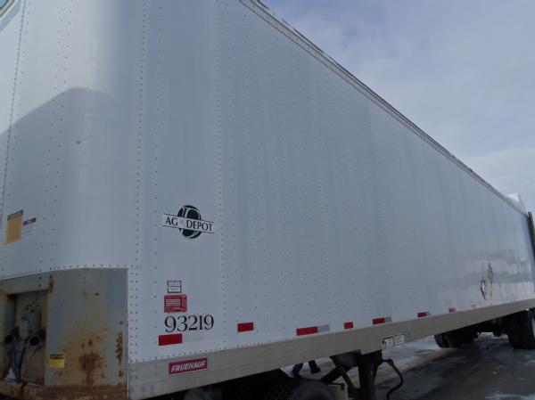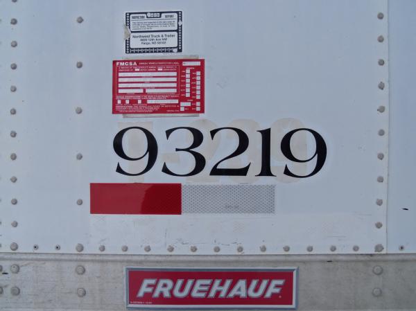 1996 Fruehauf 53' box van trailer (Unit 93219), tandem axle, 22.5 tires, rear cargo doors. This trailer has recently developed a leak in the roof due to heavy amounts of snow.