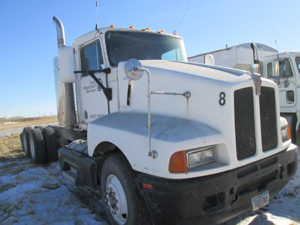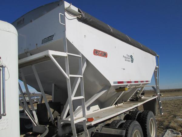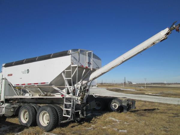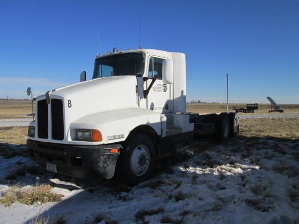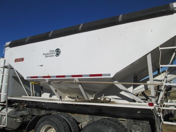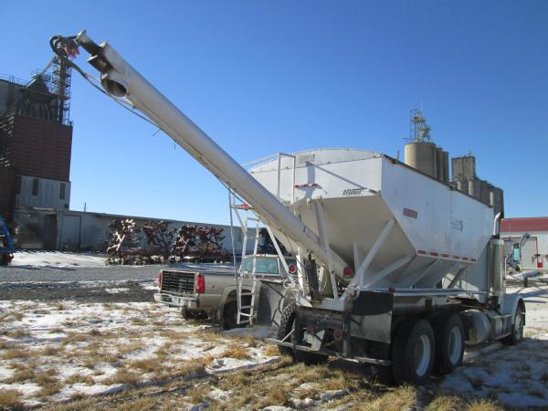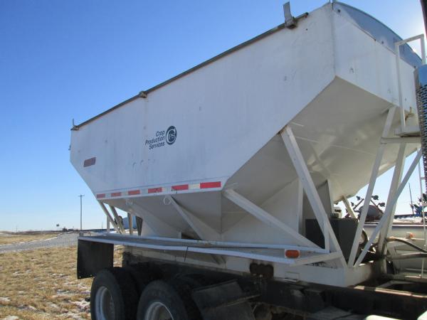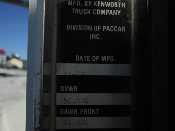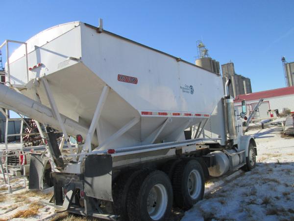 1990 Kenworth T600, 60 Series Detroit diesel engine, 10 speed transmission, air conditioning, heat, cruise control, tandem axle, full screw, air ride suspension, Willmar 16 ton dry tender box, rear discharge auger, all hydraulic, roll over tarp, shows 638,183 miles.