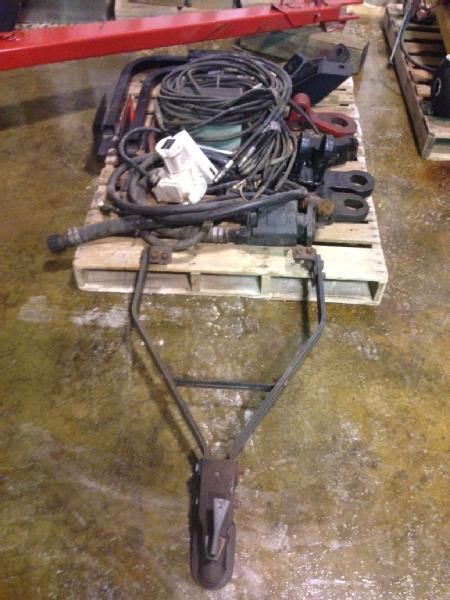 Several lengths of hydraulic hose with fittings. 12V foamer box, motor & valves. Floater truck air-shutoff box. Several deep till, disc, field cultivator hitches for CNH tillage tools. 1955 Military Jeep CJ-3 tow bar hitch. Set of tillage tool arms for flasher lights. Hydraulic motor with Hyd. hoses.