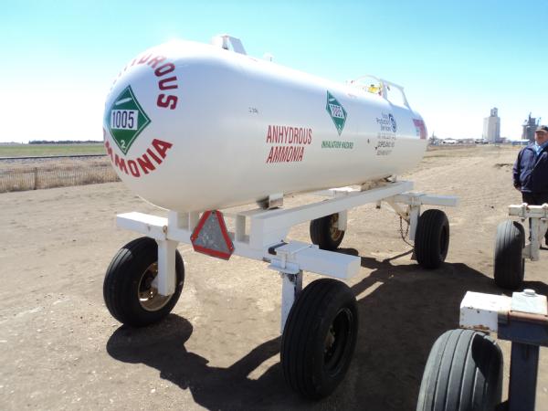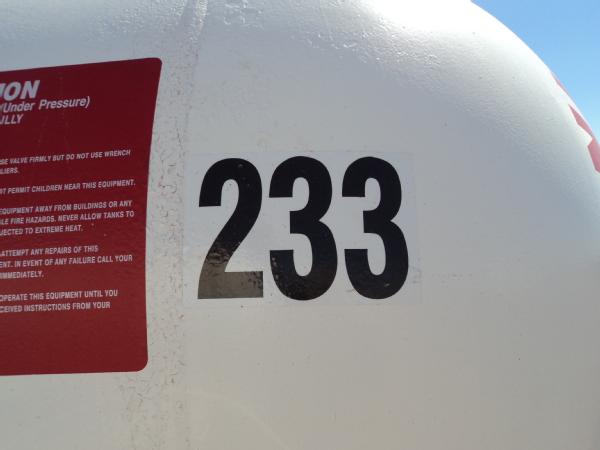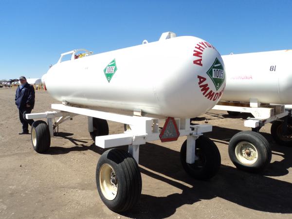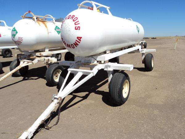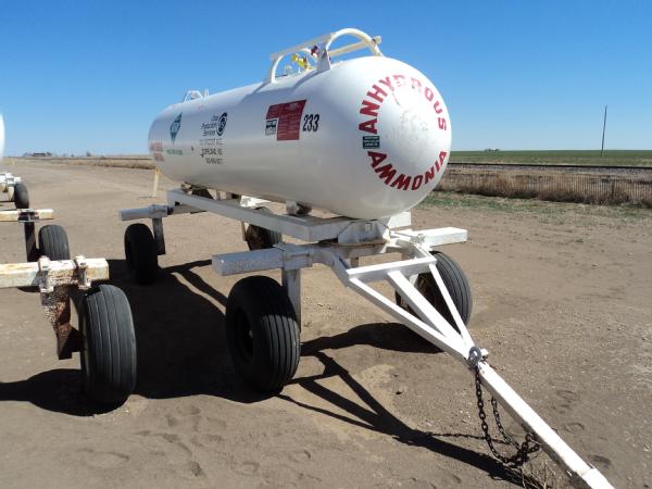 1,000 gallon anhydrous nurse tank (Unit 233), top front fill, 4 wheel running gear, 11L-15 flotation tires, data plate.