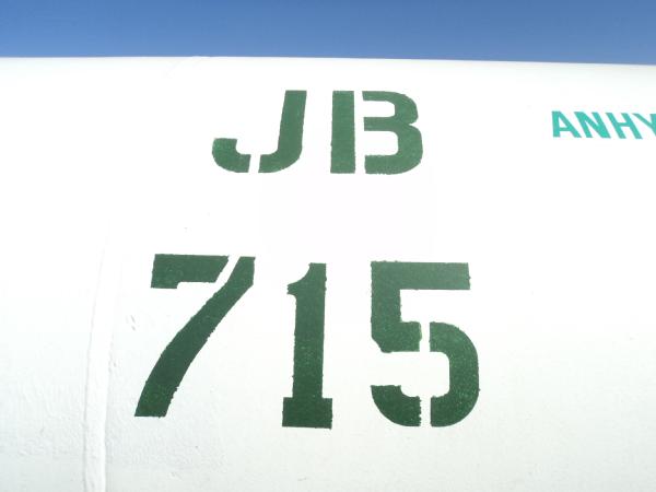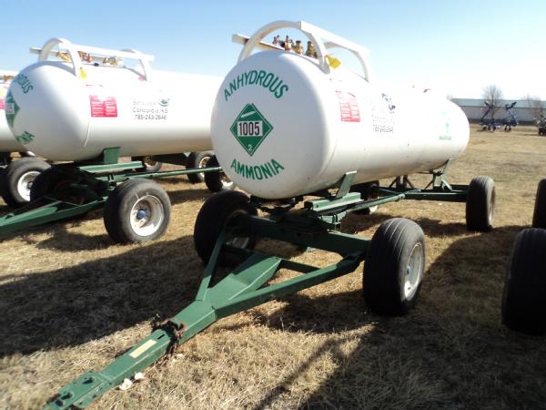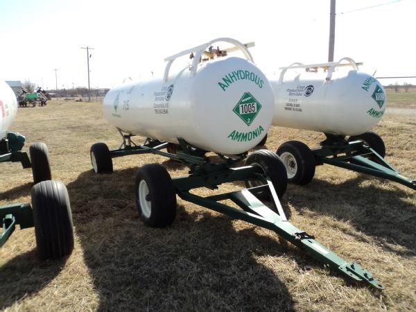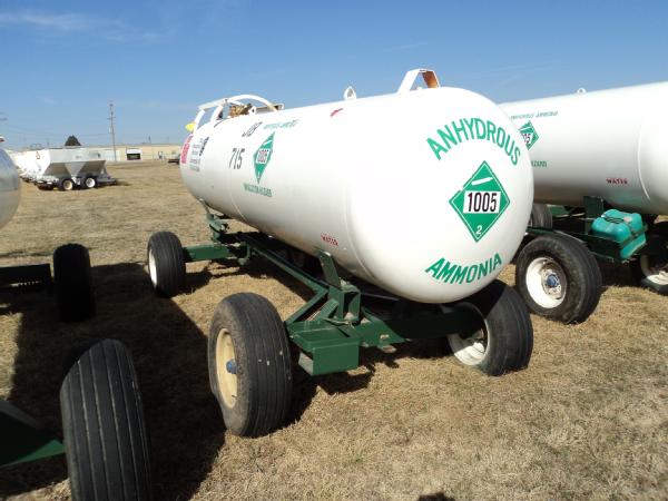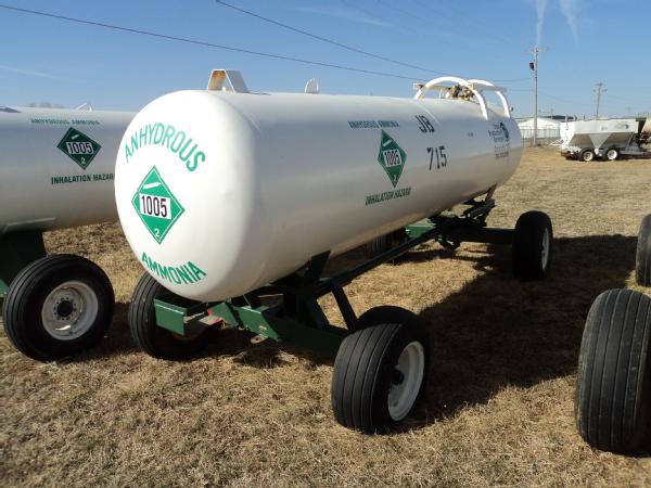 Trinity Steel Co., Inc. 1,000 gallon anhydrous nurse tank (Unit JB715), top front fill, 4 wheel running gear, 11L-15 flotation tires, data plate.