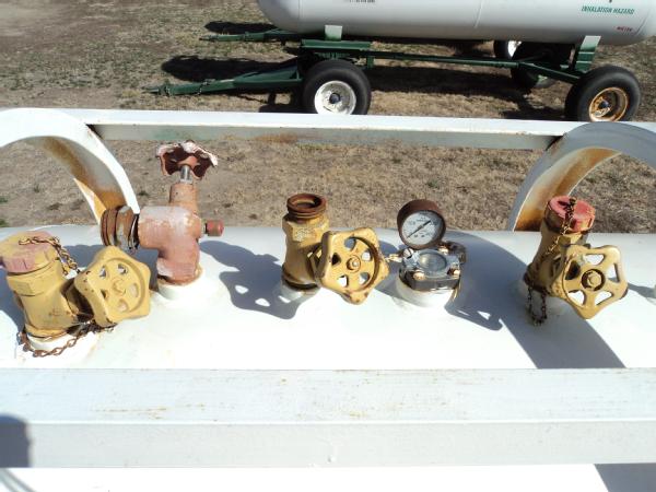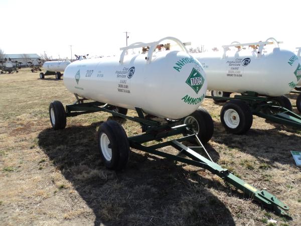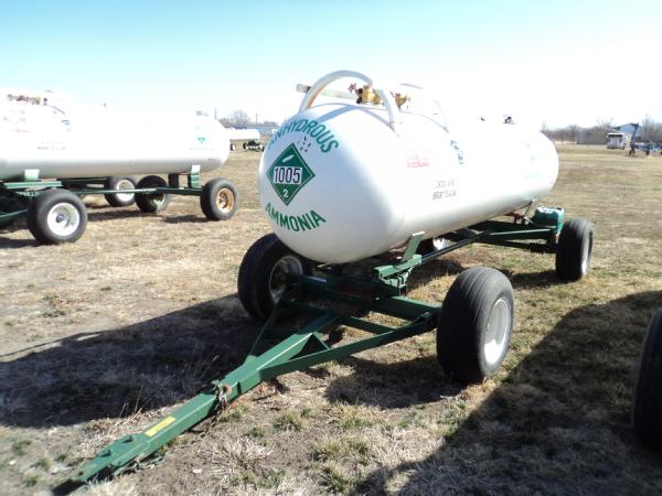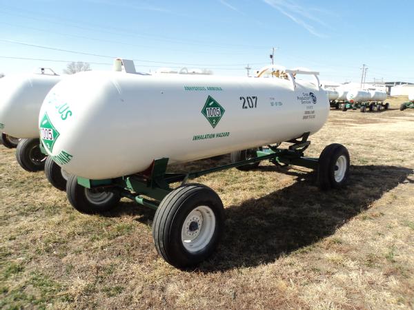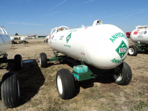 1,000 gallon anhydrous nurse tank (Unit 207), top front fill, 4 wheel running gear, 11L-15 flotation tires, data plate.
