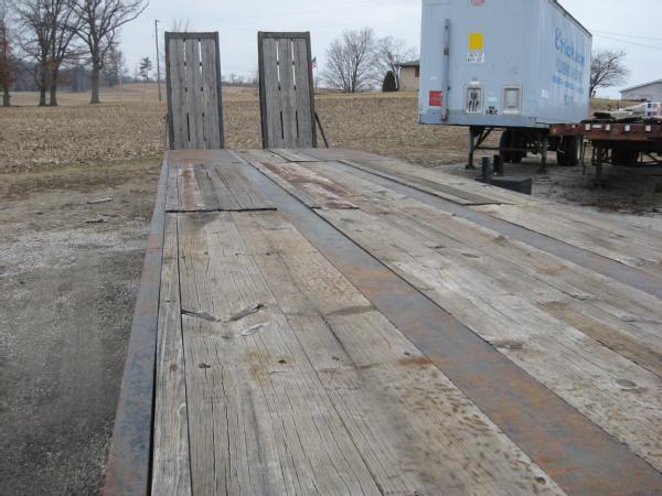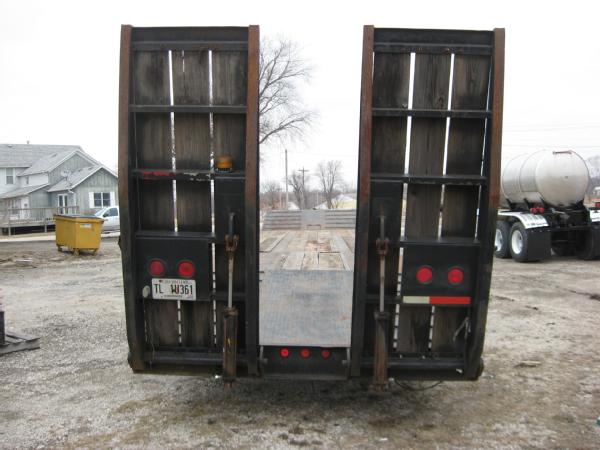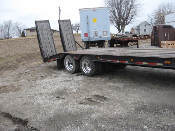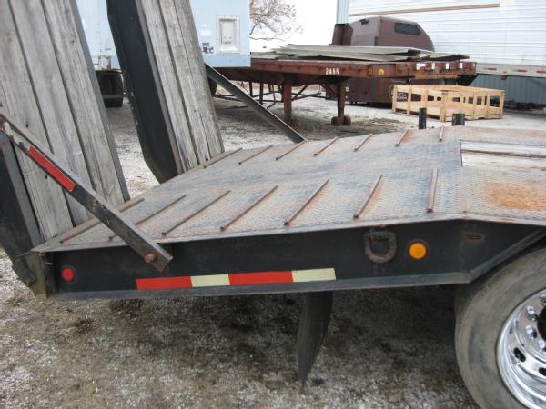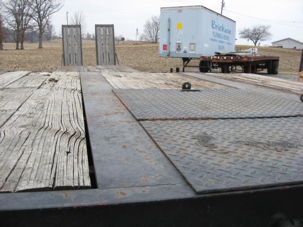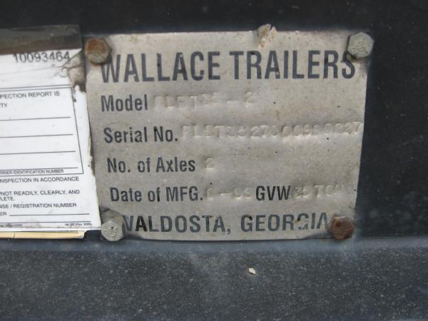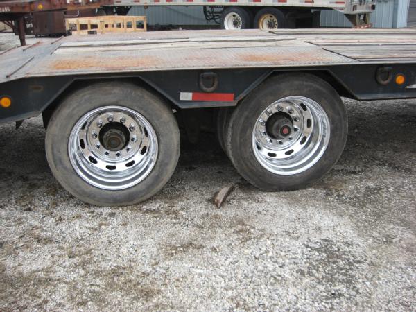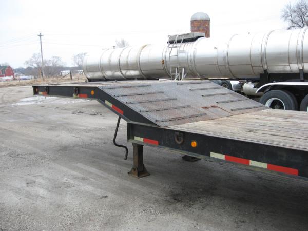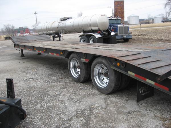 2000 Wallace 48' lowboy trailer, 102" wide, 40" deck height, 35 ton, tandem axle, electric over hydraulic ramps, 255/70R22.5 tires, aluminum wheels.
