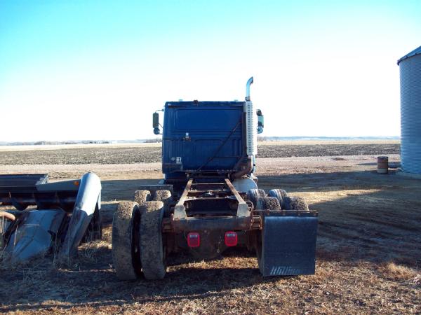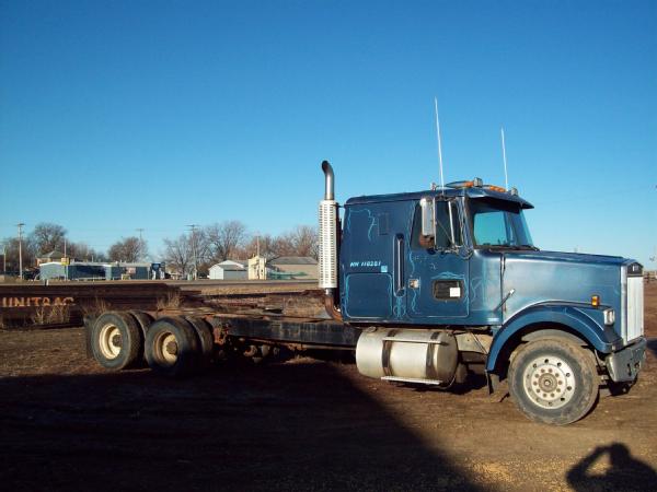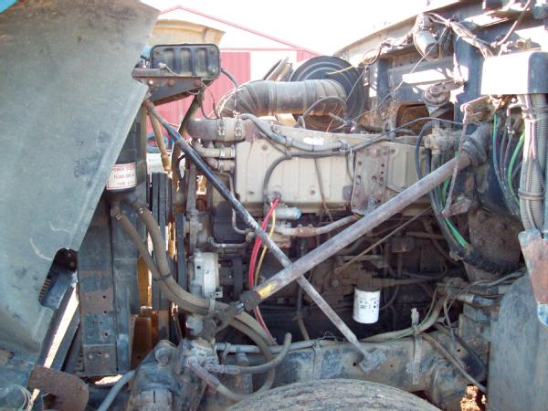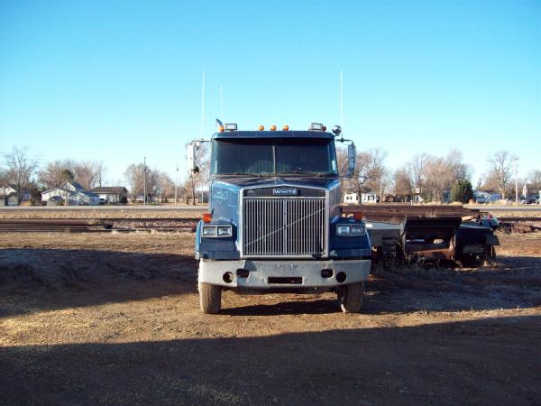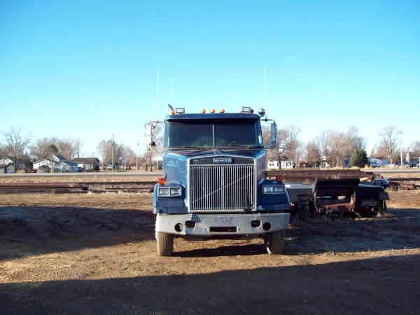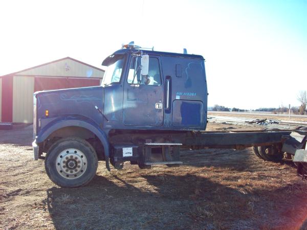 1987 White/Volvo straight truck, Cummins Formula diesel engine, 13 speed transmission, heat, air conditioning, Am/Fm radio, small sleeper, tandem axle, been stretched, spring ride suspension, steel rear wheels, aluminum front wheels, shows 904,946 miles.