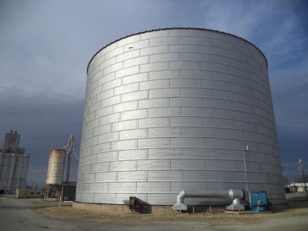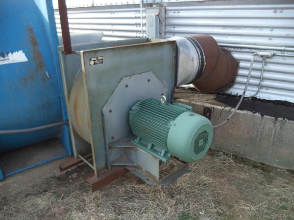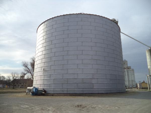 330,000 bushel corrugated and galvanized steel grain bin, concrete floor with concrete support pilings to bedrock, channelized aeration system with single centrifugal fan, two tube aeration systems with centrifugal fans, roof vents and blower fans, 16" discharge auger.
