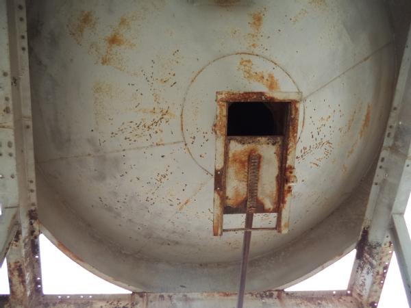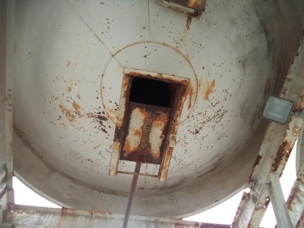 Mild steel two compartment overhead fertilizer hopper bin no longer in use.