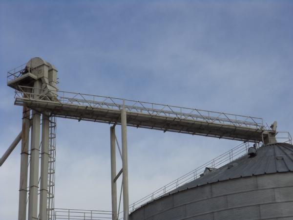 Conveyance equipment including two 200 bushel receiving pits with 16" augers to the legs, two 108' x 8000 bph painted elevator legs, two overhead distribution paddle conveyors on catwalk.
