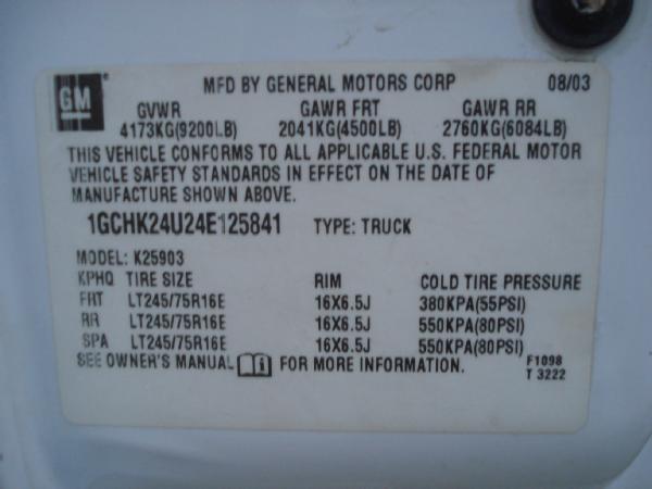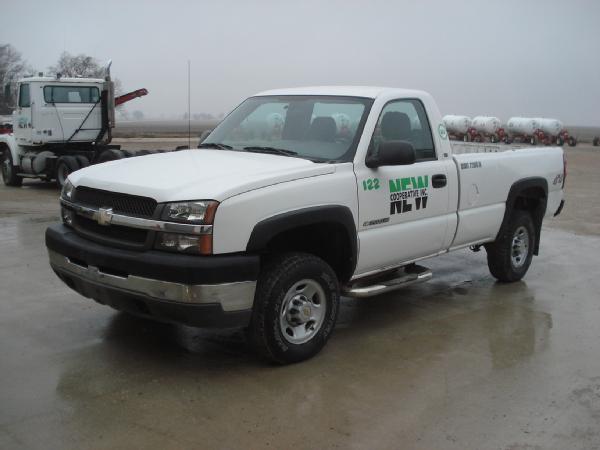 2004 Chevrolet 2500HD Silverado 4x4 (Unit 122), air conditioning, heat, Am/Fm radio, running boards, LT245/75R16 tires, shows 86,638 miles.