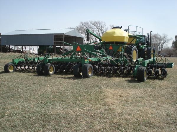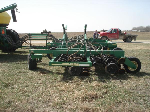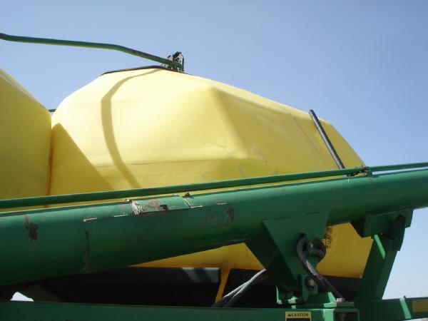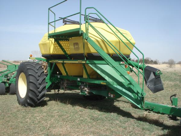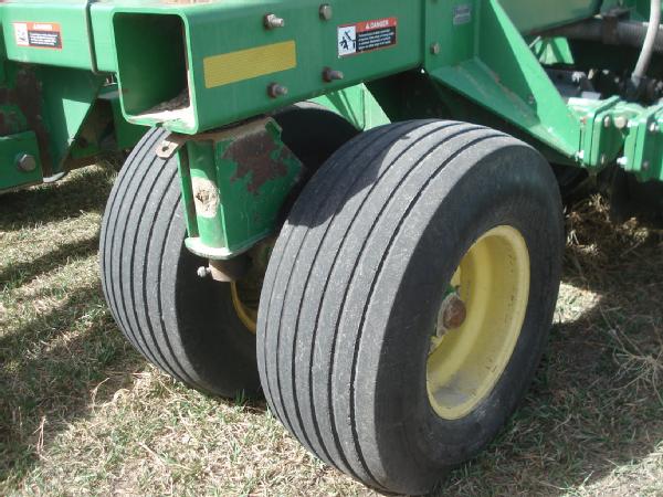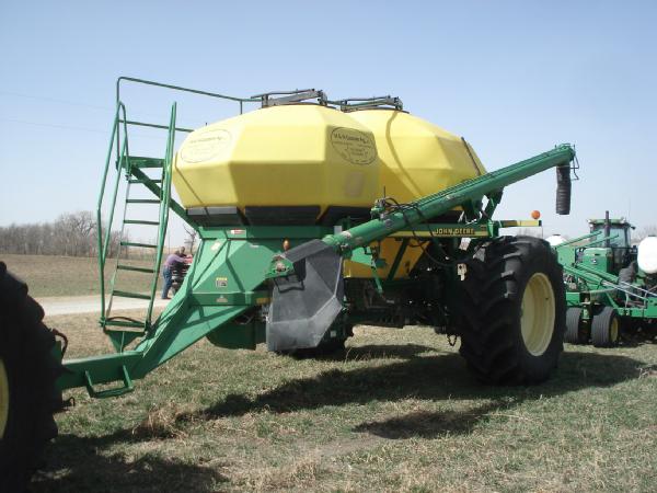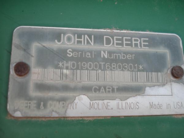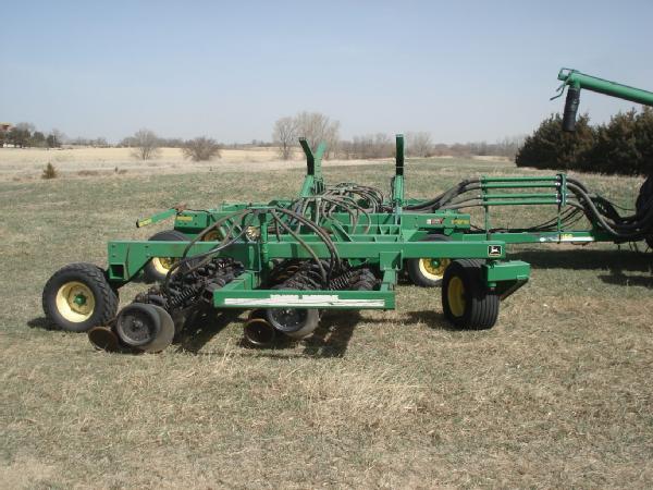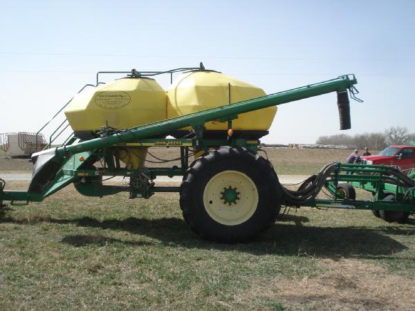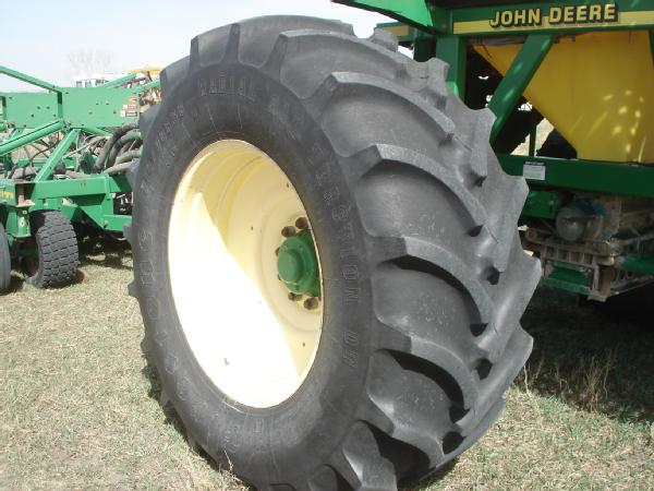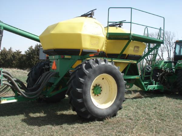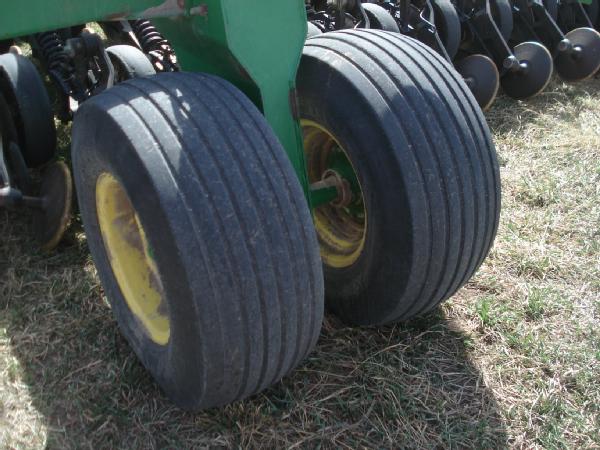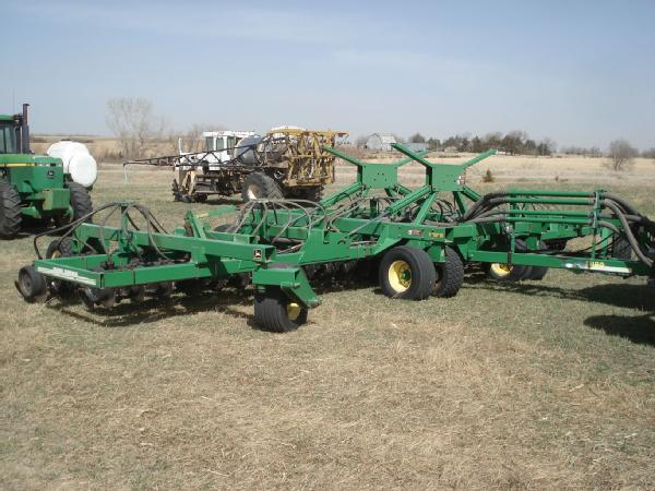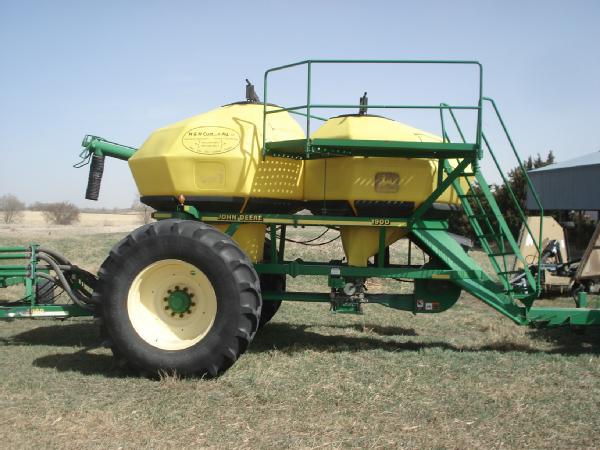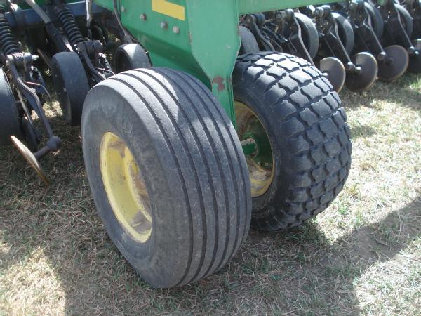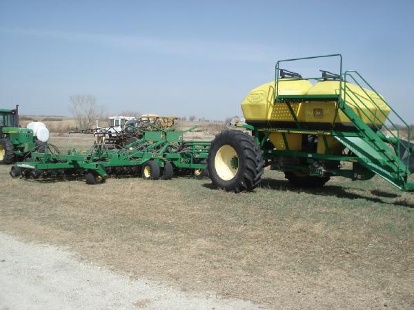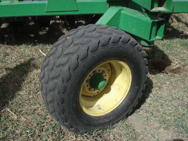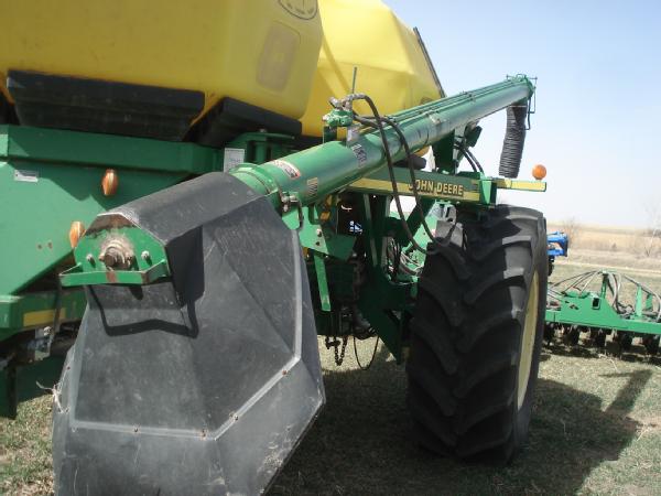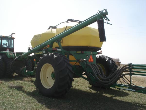 John Deere 1900 commodity cart, 120 front, 150 rear, 710/70R38 tires, with John Deere 1860 drill, 36', 7.5" spacing, 3 meters (2-black, 1-yellow), 31 x 13.50-15 tires.