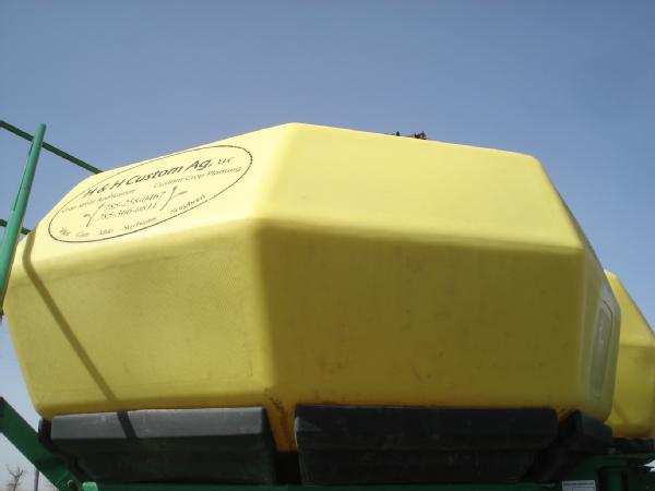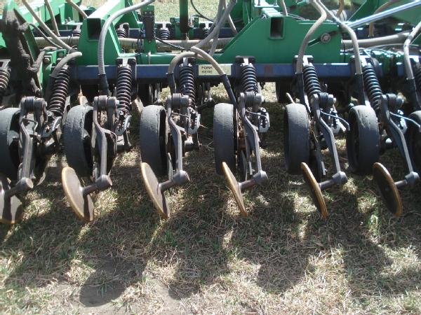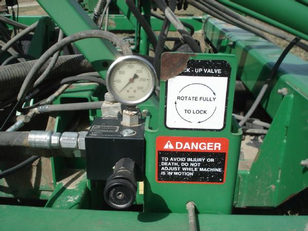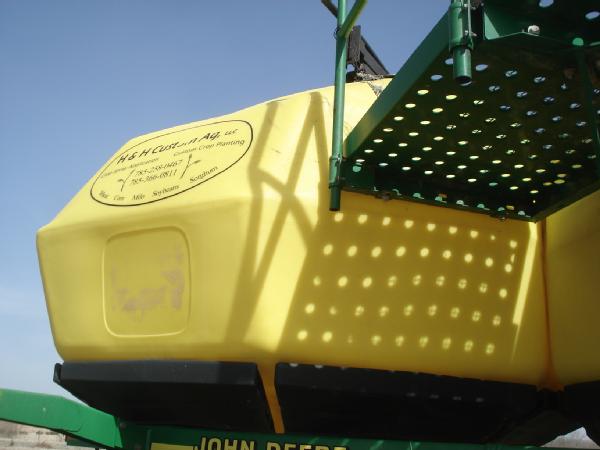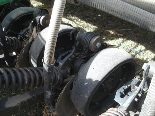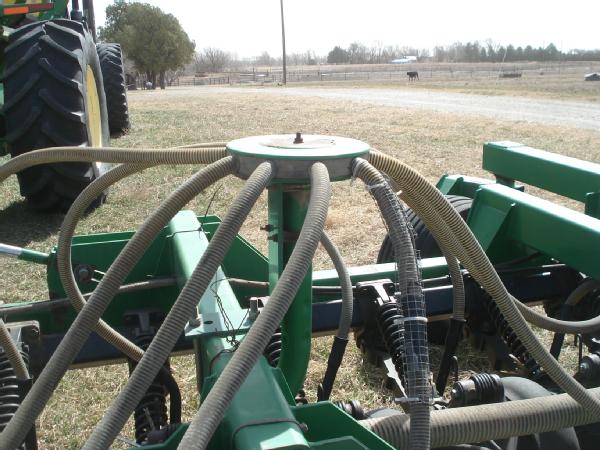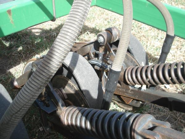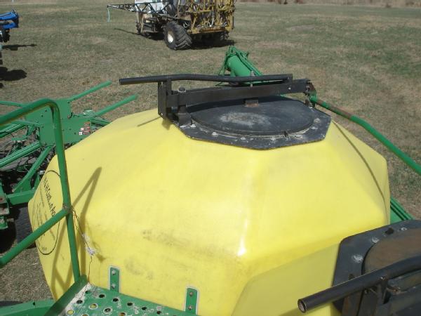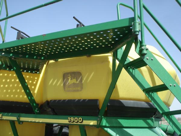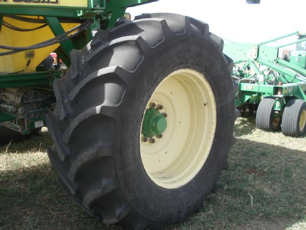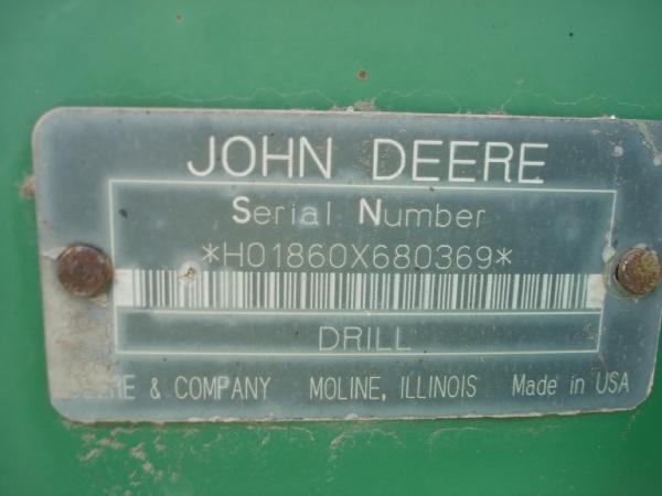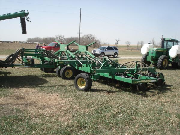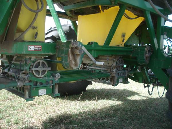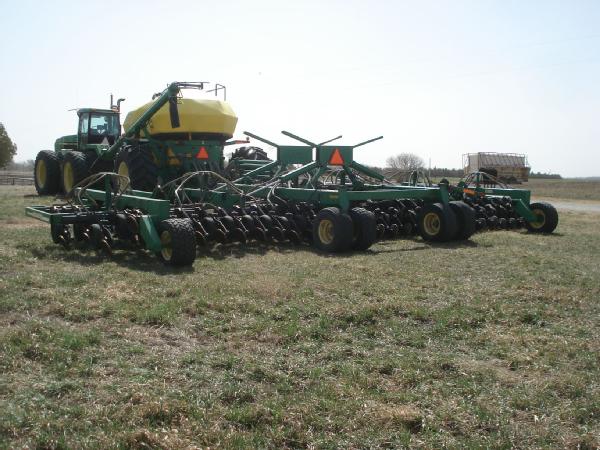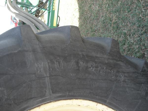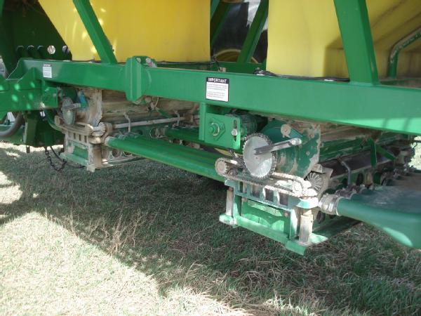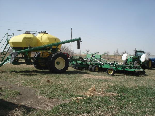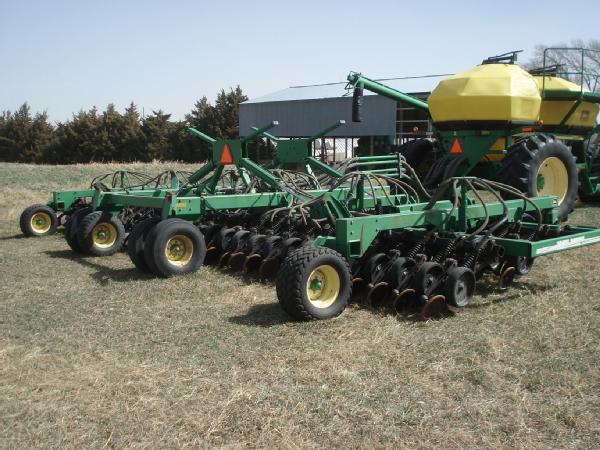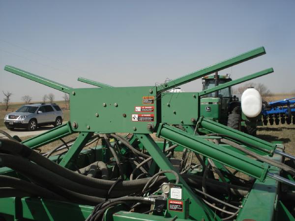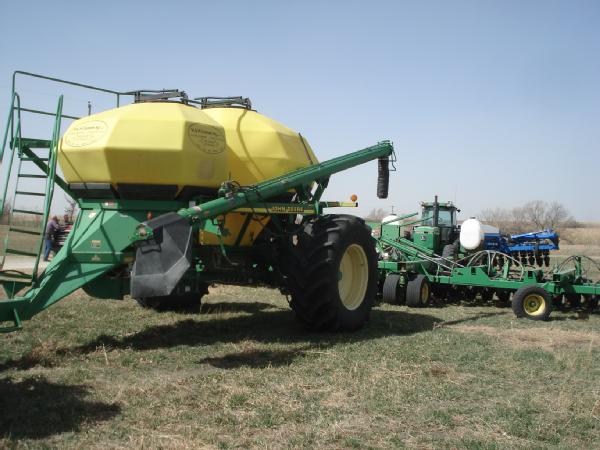 John Deere 1900 commodity cart, 120 front, 150 rear, 710/70R38 tires, with John Deere 1860 drill, 36', 7.5" spacing, 3 meters (2-black, 1-yellow), 31 x 13.50-15 tires.