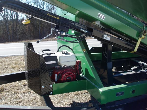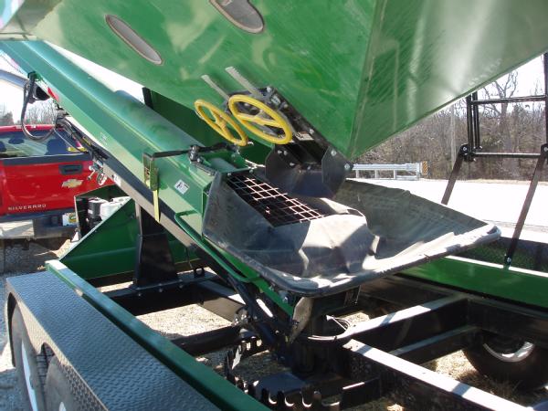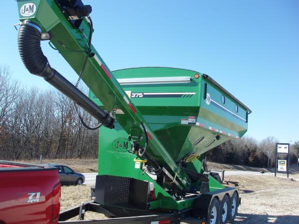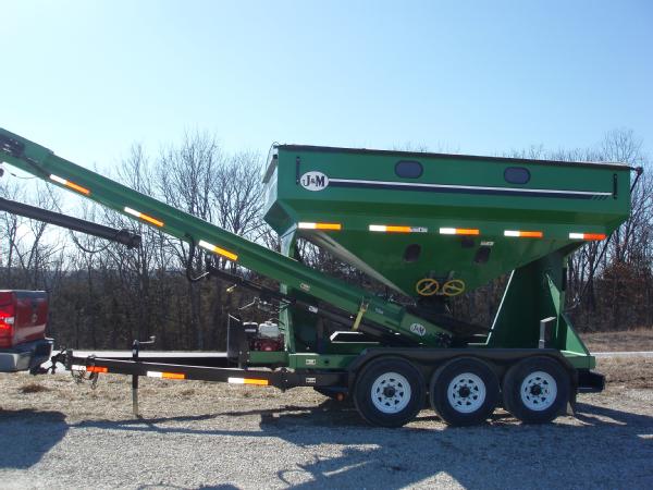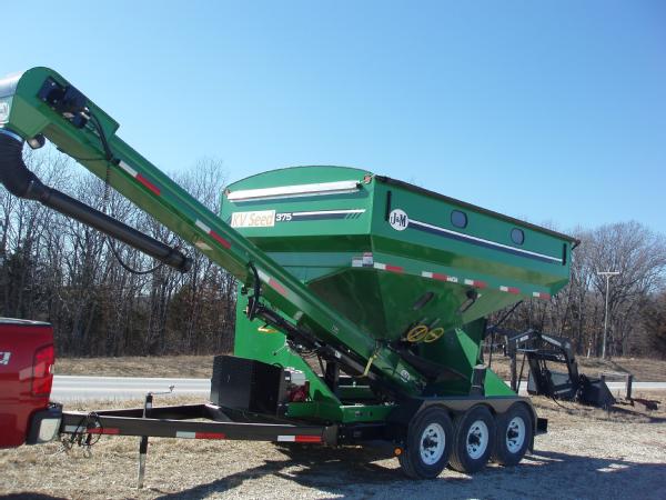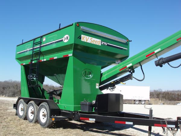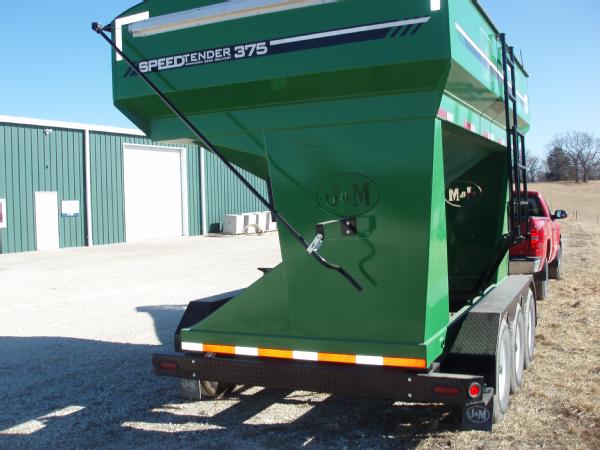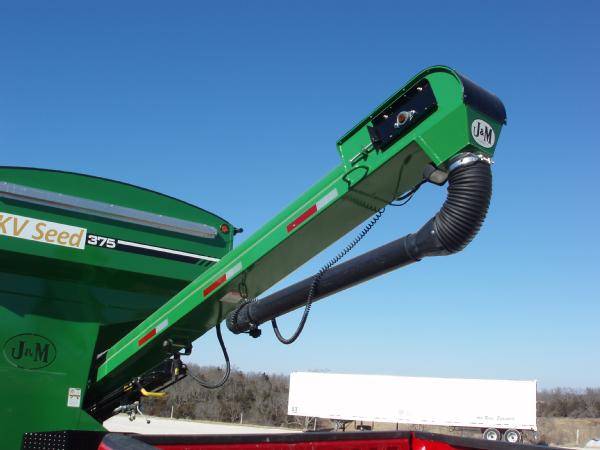 2012 J&M Seed Tender, 375 unit capacity, 49' left to right spout reach, up to 37 bu/min unloading speed, self load conveyor, Honda electric start gas motor, roll over tarp, like new.