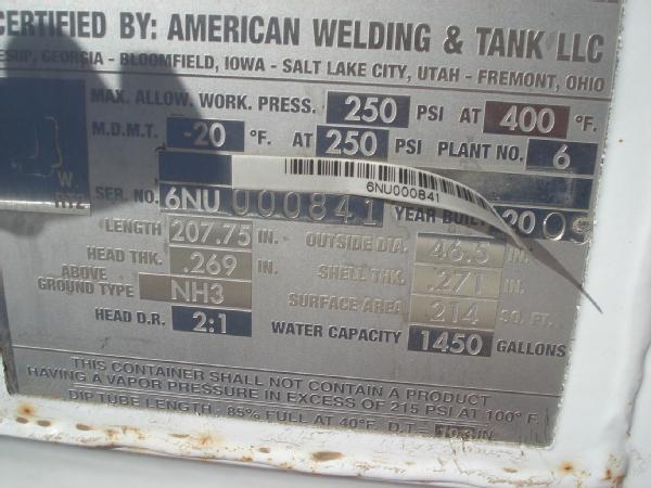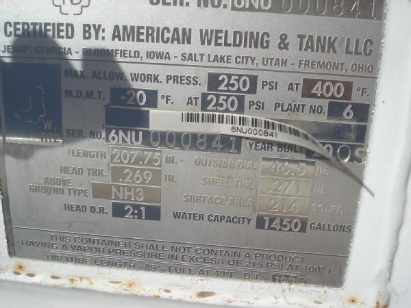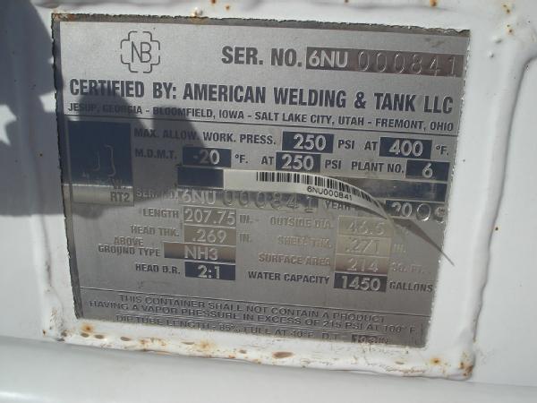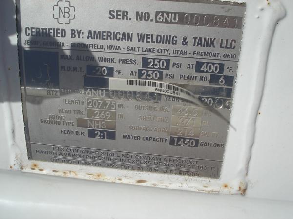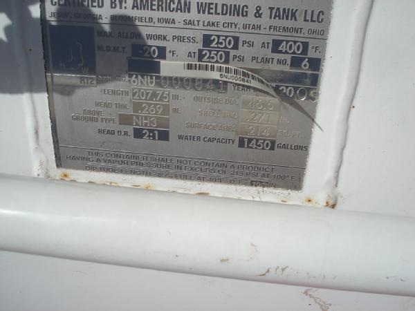 2009 American Welding & Tank 1450 gallon anhydrous nurse tank (Unit 1), top front fill, water tanks, Duo Lift extra wide running gear, 14L-16.1SL flotation tires, Nat'l Board #6NU000841.