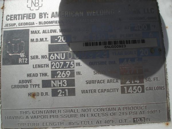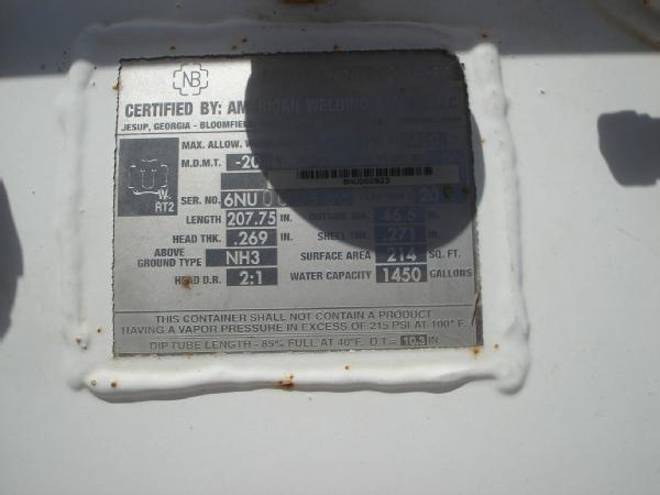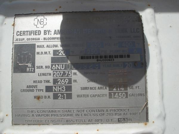 2009 American Welding & Tank 1450 gallon anhydrous nurse tank (Unit 2), top front fill, water tanks, Duo Lift extra wide running gear, 14L-16.1SL flotation tires, Nat'l Board #6NU000923.