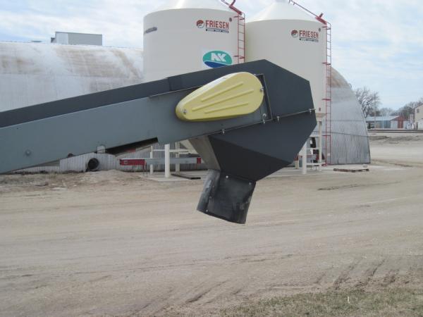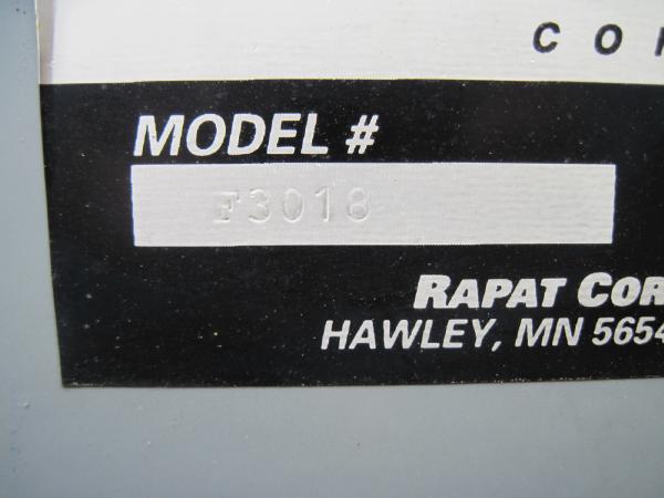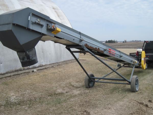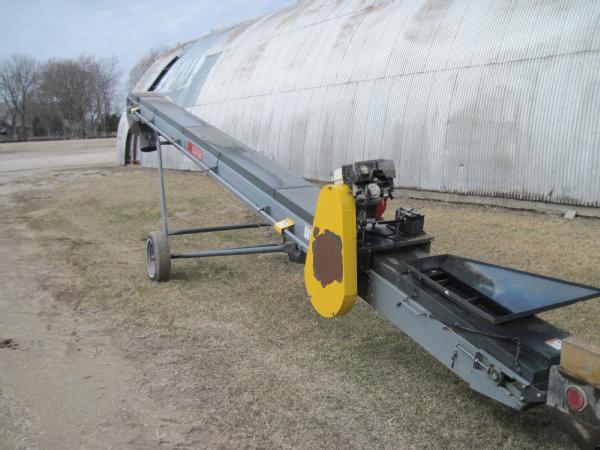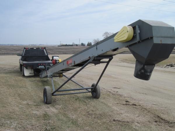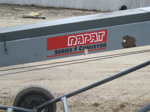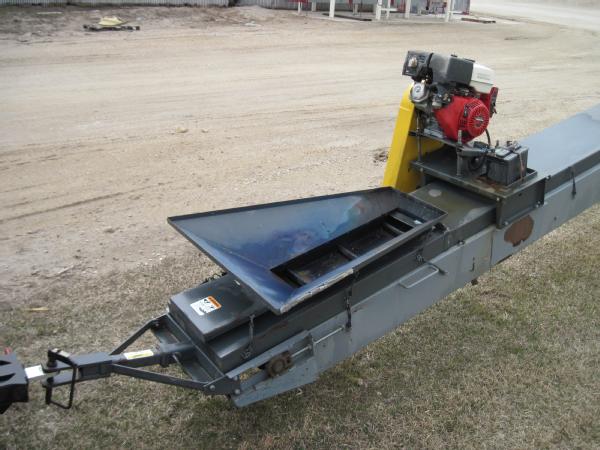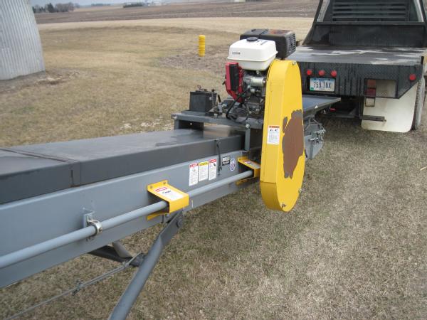 Rapat model F3018, 30' seed conveyor, Honda 13 hp gas engine, rubber belt with tall cleats to move seed beans, portable, drawbar hitch, cable to raise/lower.