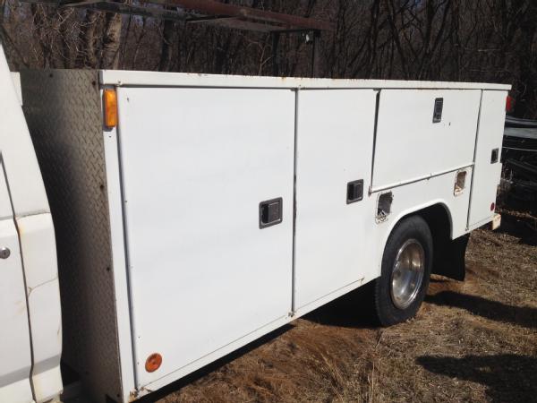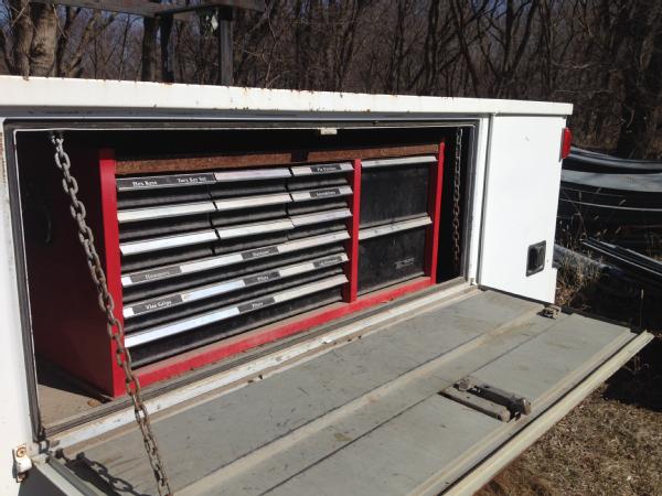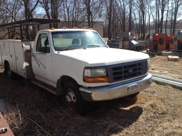 1994 Ford service truck, automatic transmission, heat, air conditioning, Am/Fm radio, dually, Rawson-Koenig service body, tool drawers.