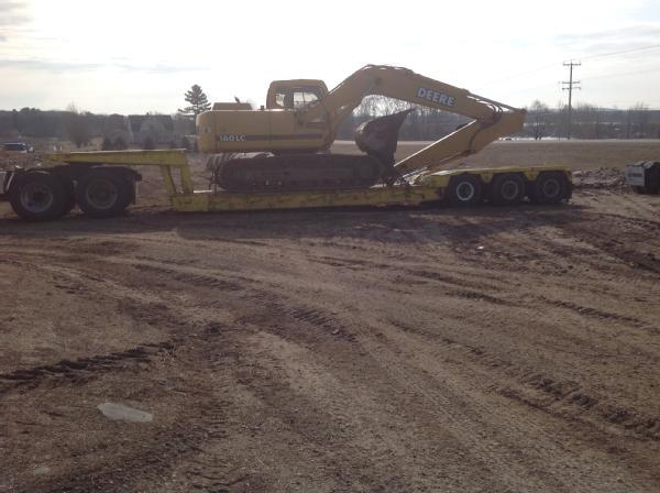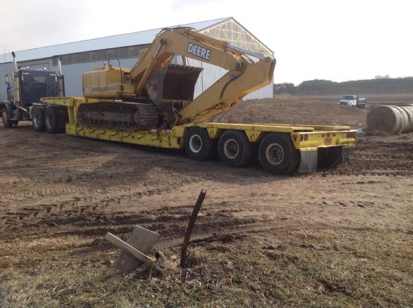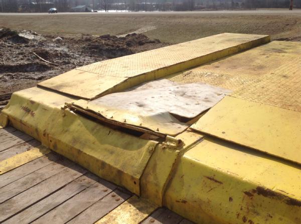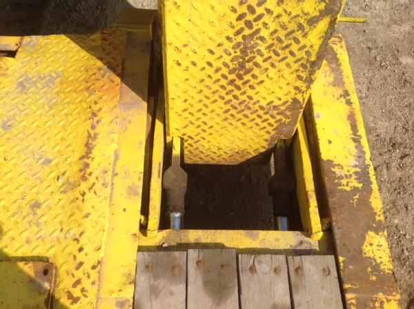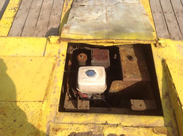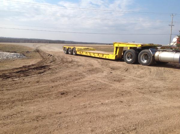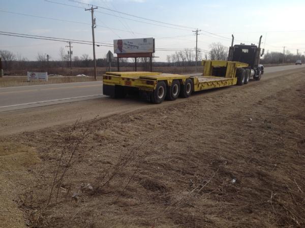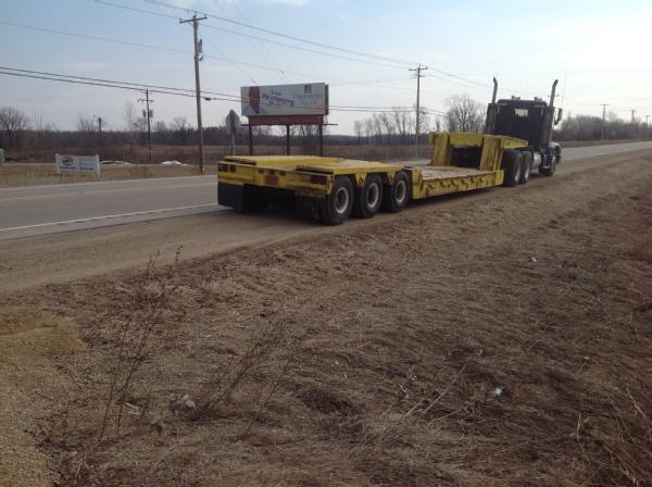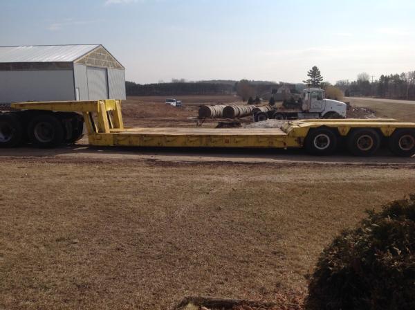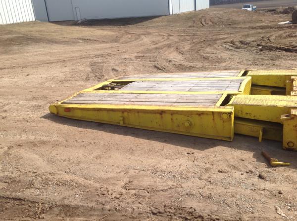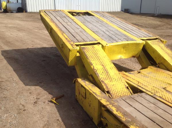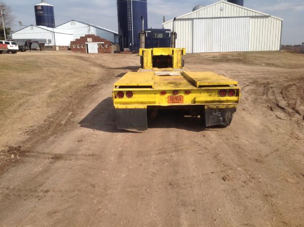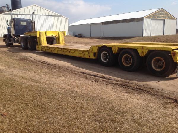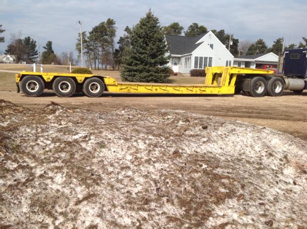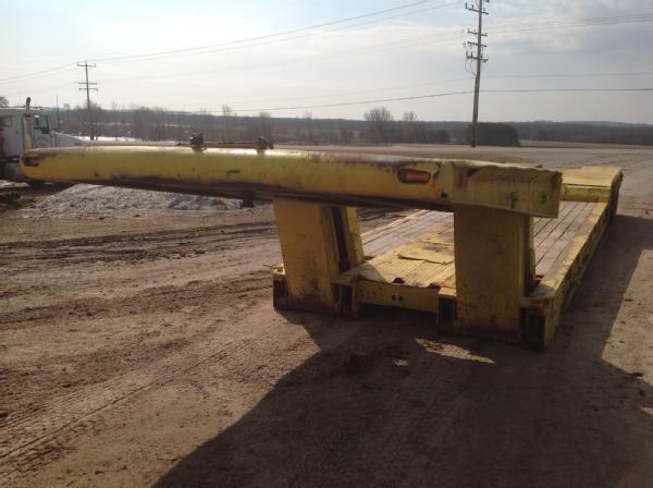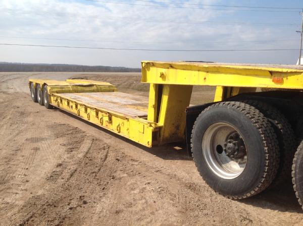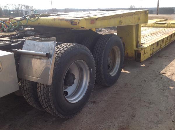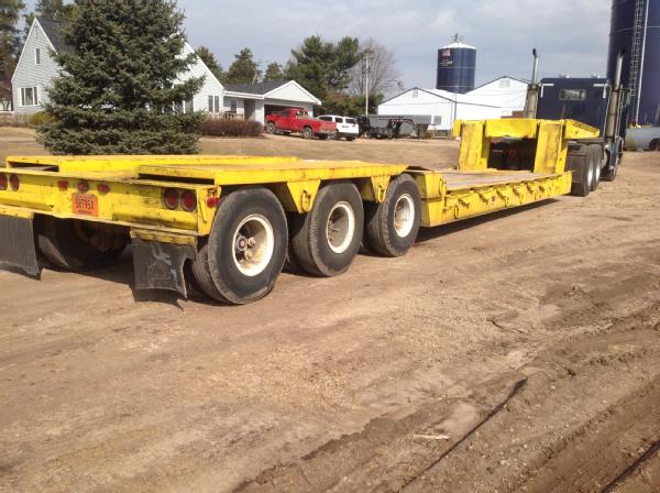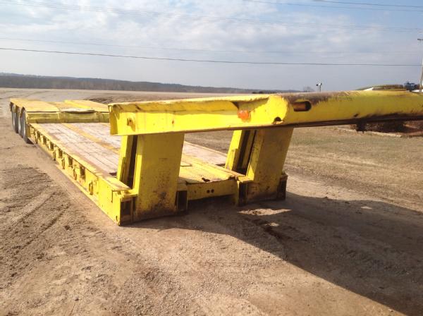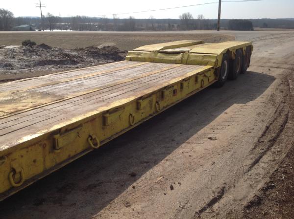 1976 Hyster 50 ton lowboy trailer, 42' x 96", 18' belly, 13' over rear axles, triple axle, spring suspension, air brakes, outriggers, 10.00-15 tires 60%, steel wheels.
