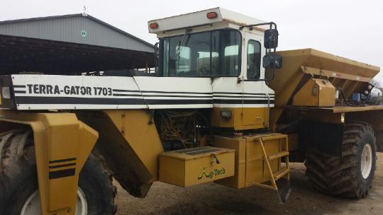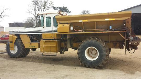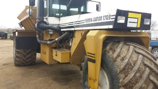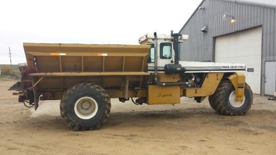1991 Terra Gator 1703, 8.3L Cummins 6CTA diesel engine, Allison automatic transmission, heat, air conditioning, Am/Fm radio, New Leader L3020 dry spreader box, all hydraulic, 50% front tires, 40% rear tires, Raven SCS660 monitor, shows 5309 hours.