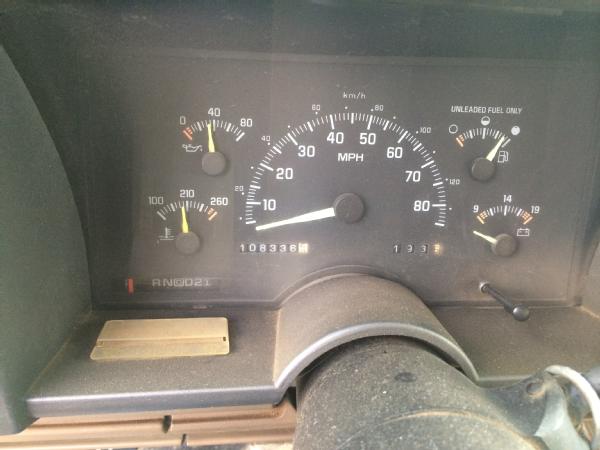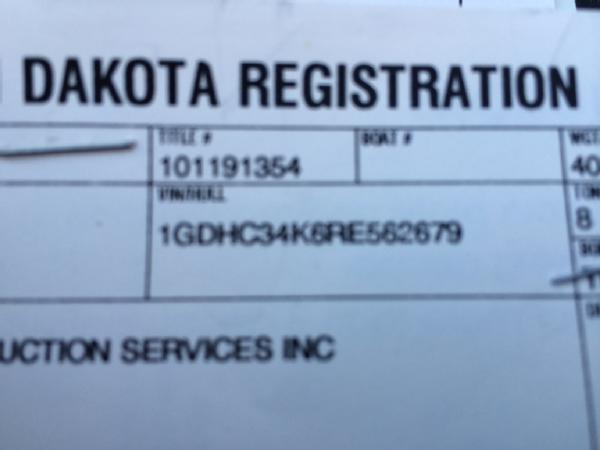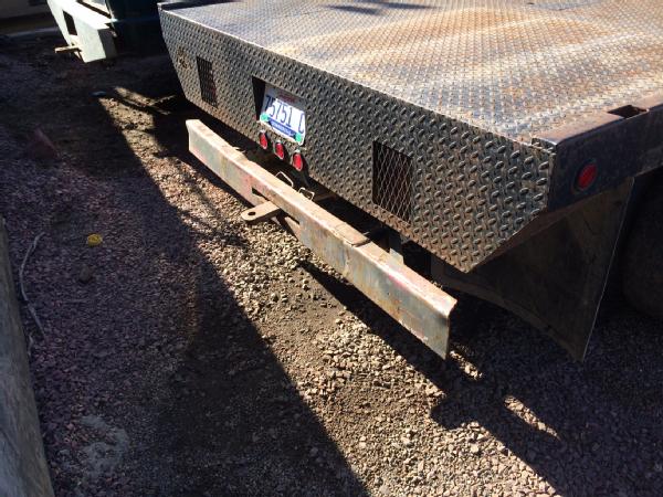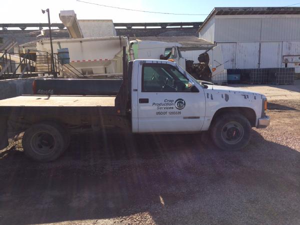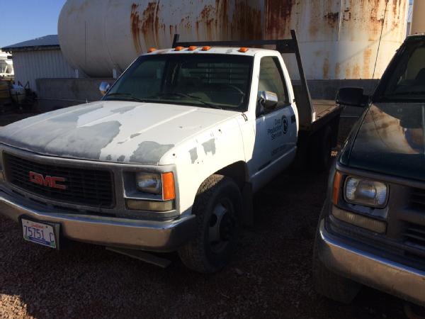 1994 GMC 3500 2x4, 5.7L V8 gas engine, automatic transmission (weak), heat, air conditioning, Am/Fm radio, 8' steel flatbed, headache rack, dually, 5th wheel door (no ball), ag bumper, tires fair, shows 108,336 miles.