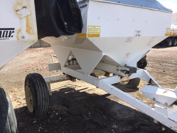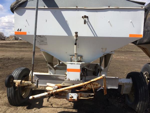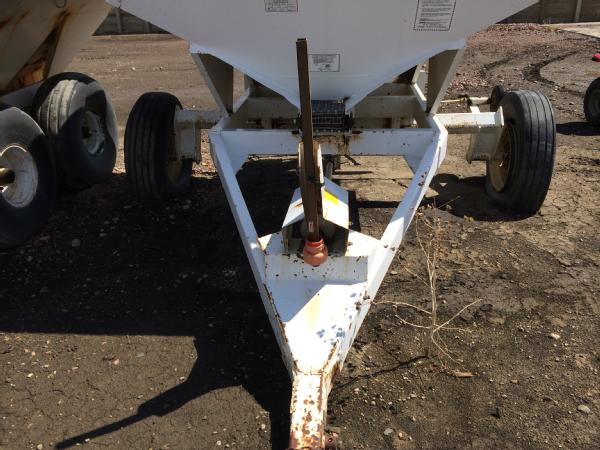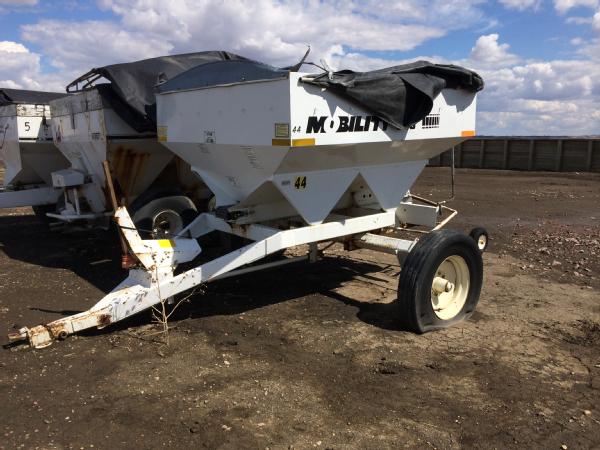 Mobility 500 pull type dry spreader for parts, spreader has been rolled, tires won't hold air, back gate and spinners are bent up.