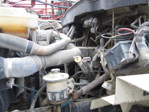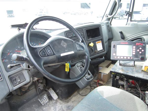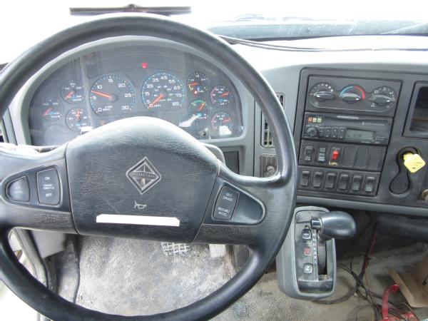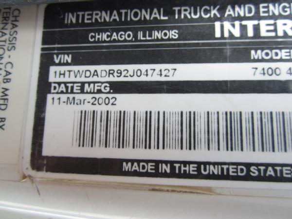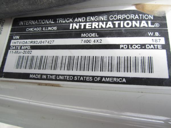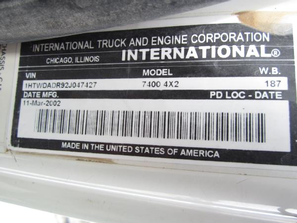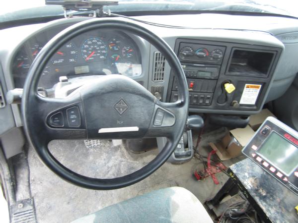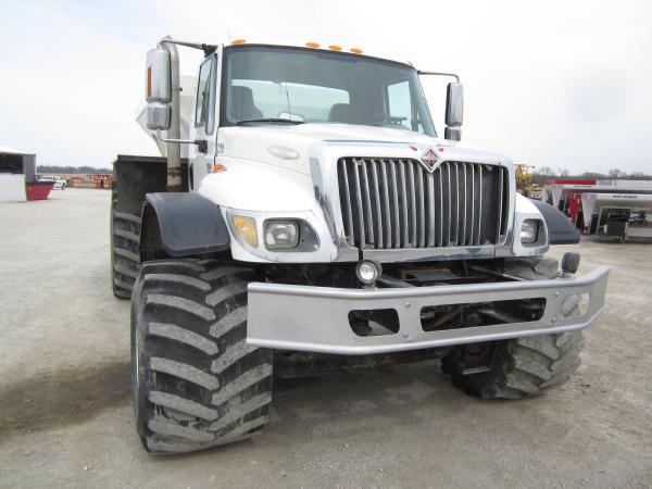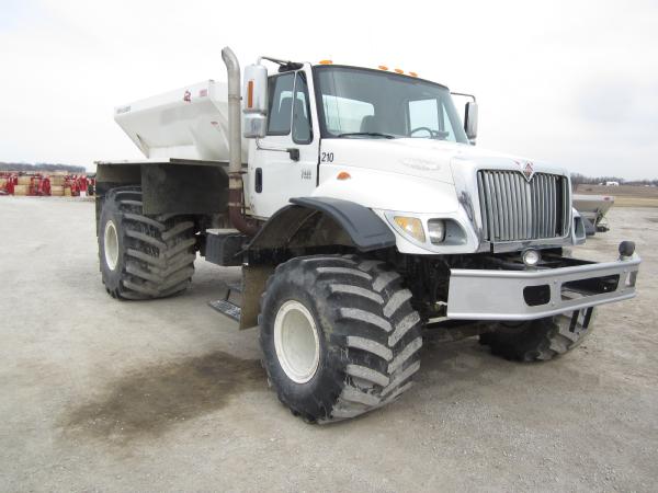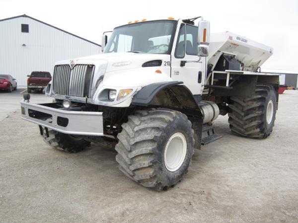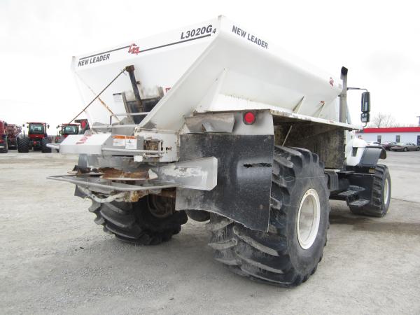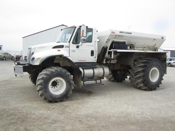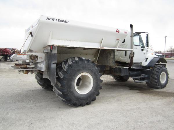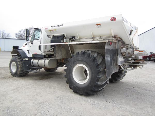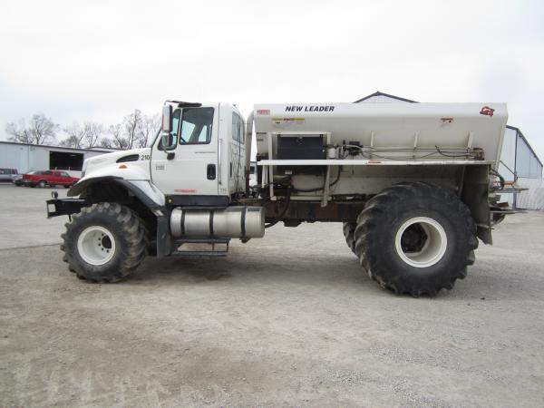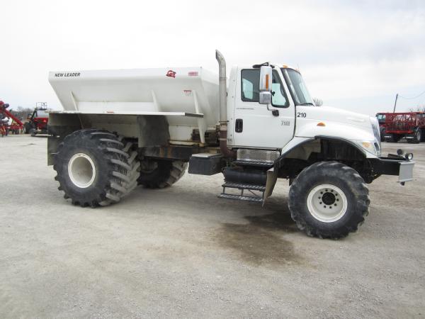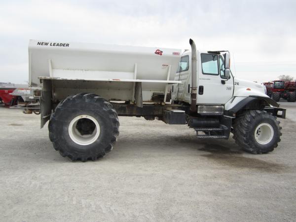 2002 IHC 7400 Silver Wheels, DT 530 diesel engine 300 hp, Allison automatic transmission, air conditioning, heat, Am/Fm radio, 2007 New Leader L3020 G4 409 stainless steel dry spreader box, 12' length, (S/N 126630), #4 belt over chain conveyor, automatic chain oiler, G4 spinner assembly, Mark V valve for conveyor control, PWM for spinner valve control, 48x31-20 14 ply fronts 40%, 66x43-25 10 ply rears 50%, New Leader DP 6 controller for spreader box control, Trimble receiver, shows 5320 hours, 78,356 miles.
