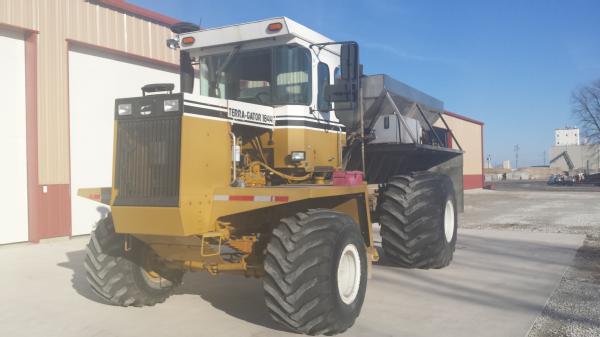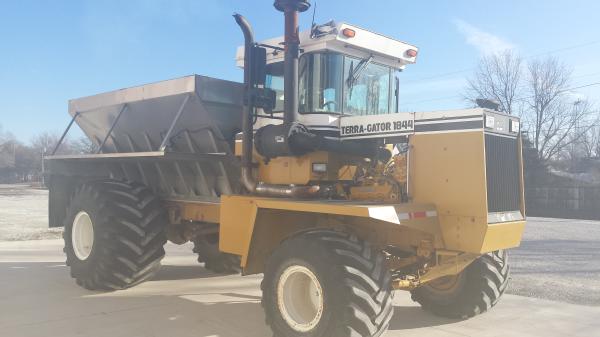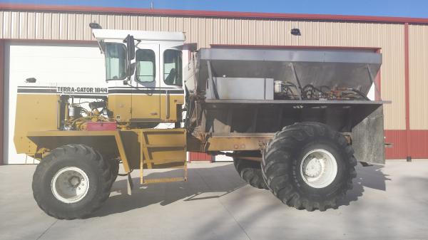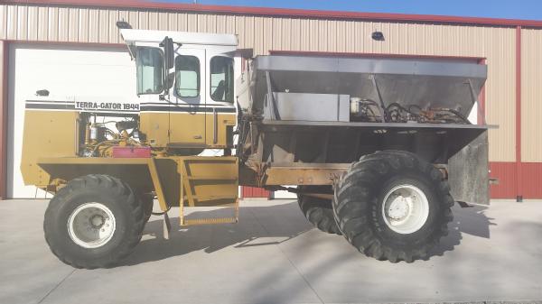 1996 Terra Gator 1844 Dry (ID# PZ-103), 3208 Cat diesel engine, Allison automatic transmission, air conditioning, heat, Am/Fm radio, Newton Crouch stainless steel dry spreader box, all hydraulic, 50% tires, Raven SCS 660 monitor, Viper 2 controllers, shows 5140 hours.