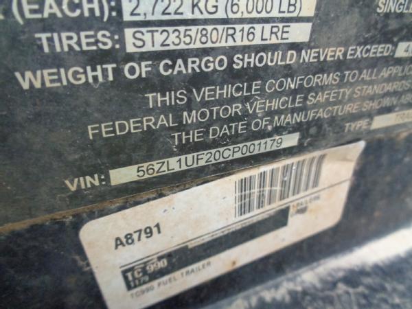 2012 Thunder Creek Fuel Trailer (ID# CP-21), Model ADT990, 990 gallon capacity, tandem axle, aluminum alloy wheels, 235/80R16 tires, gas motor w/ pump, single hose reel, sight gauge.