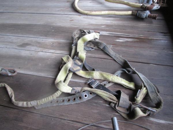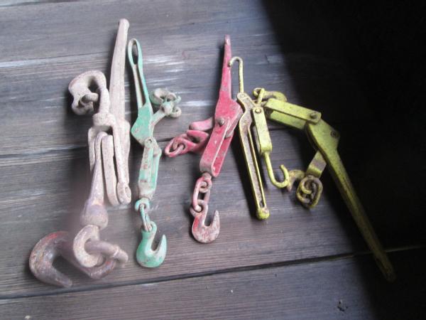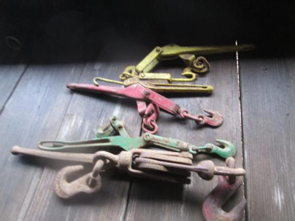 Shop Items (DR-125), 5-load binders, adjustable 3rd link arm, hitch pins & clevis, come-along, lineman harness.
