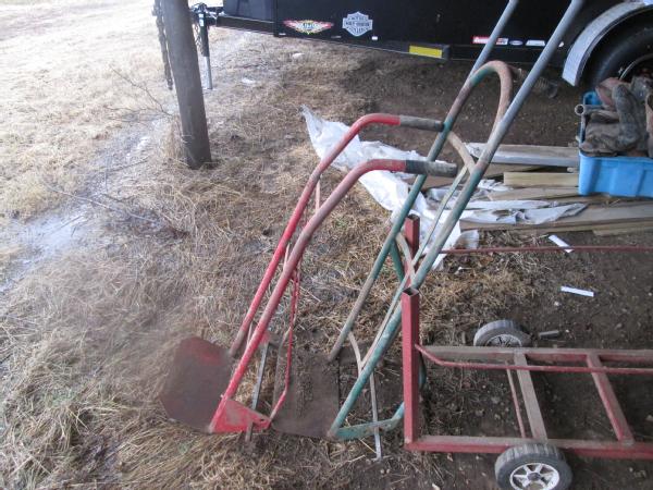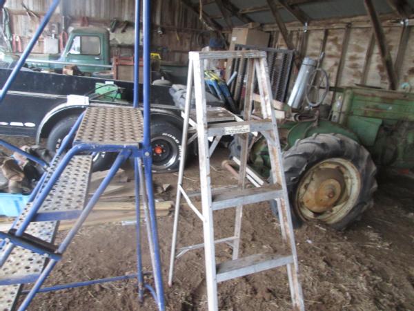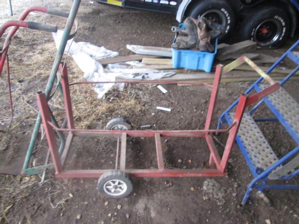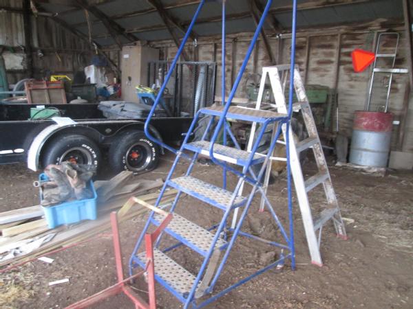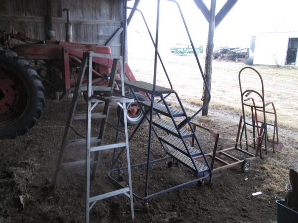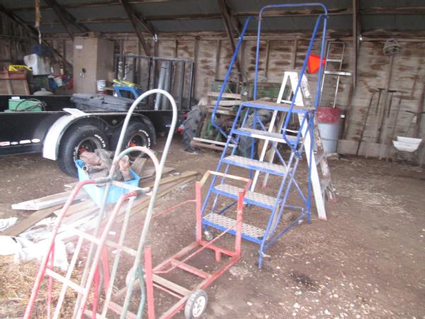 Shop Items (DR-129), 2-dock carts NEED WHEELS, rolling stairs MISSING CASTER, drum barrel cart, aluminum step ladder.