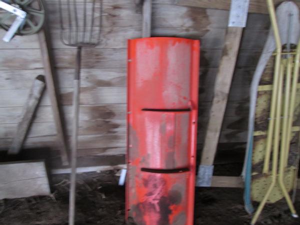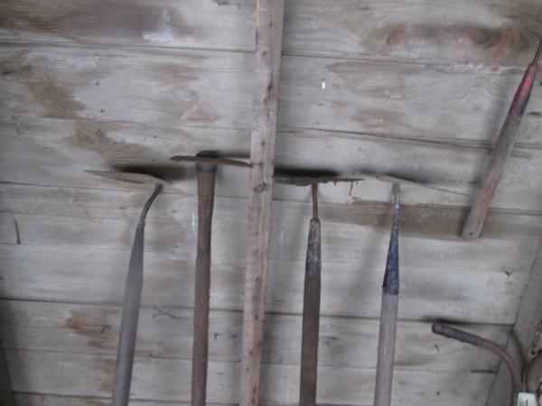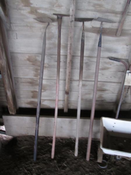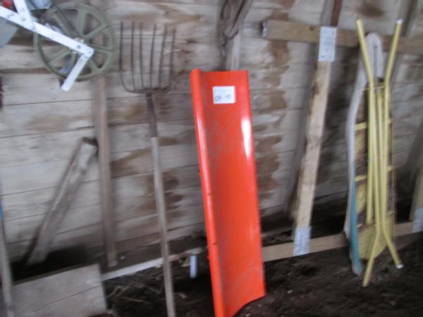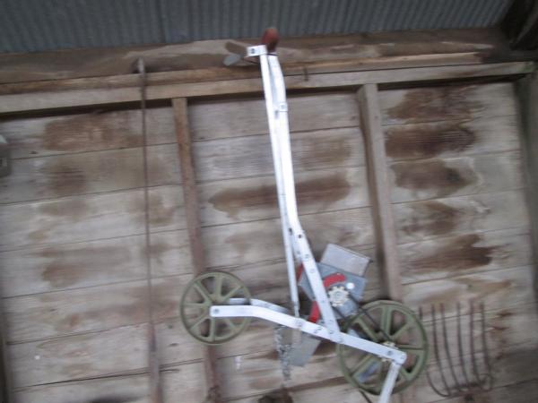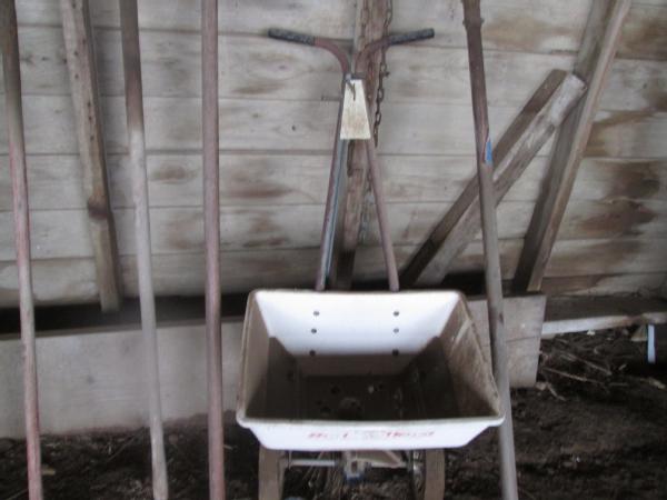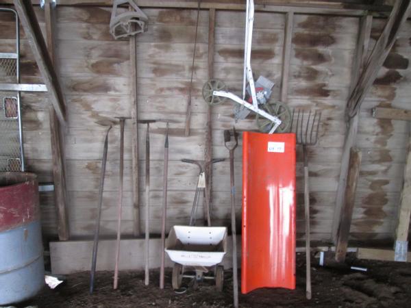 Shop Items (DR-130), gardening tools, 4-hoes, hand edger, lawn seeder, 1 row garden planter, 36" snow plow NEAR NEW.