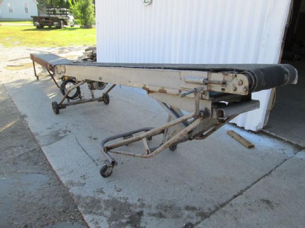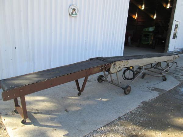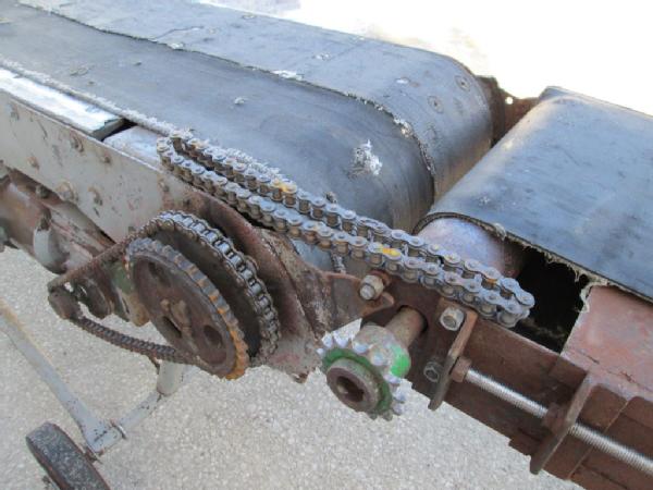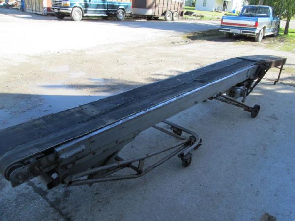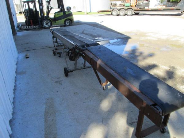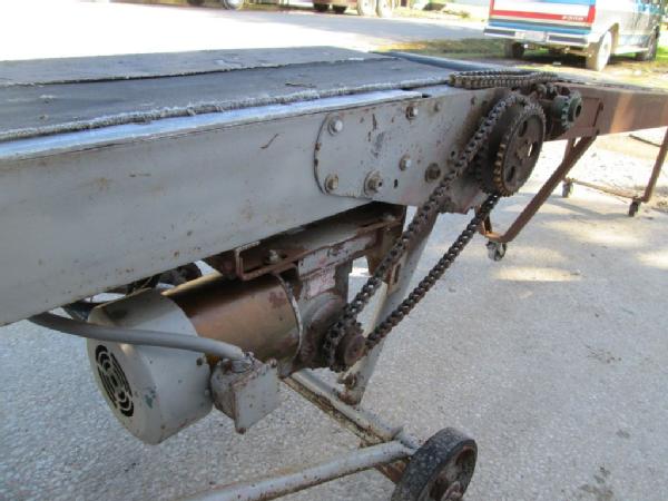 Bag Moving Conveyor (Item #119), 18' 6" long, adjustable height, pivots on one end, single phase, 110 volt motor, 15" wide belt, the belt is usable but rough, lowered measurement 24", raised height 48".