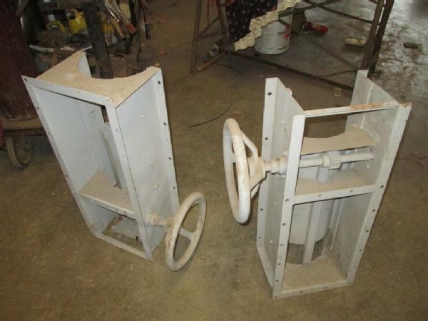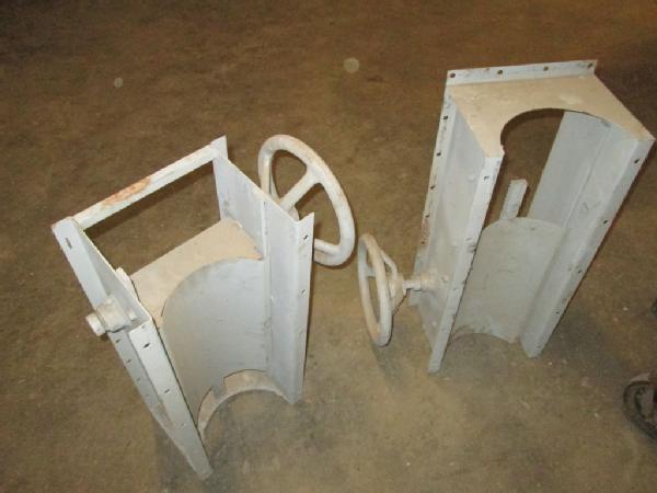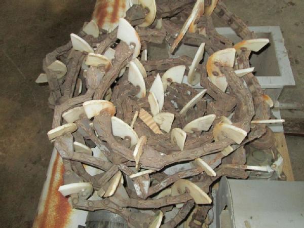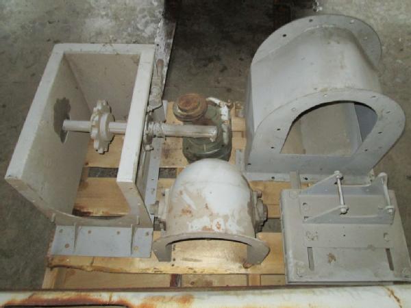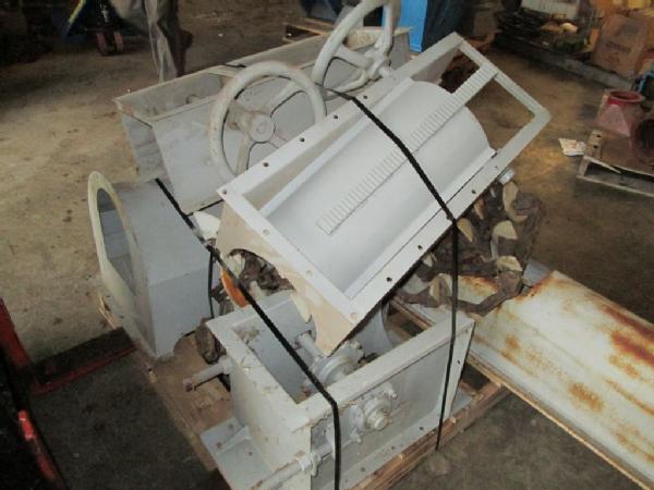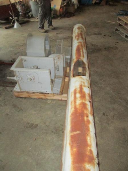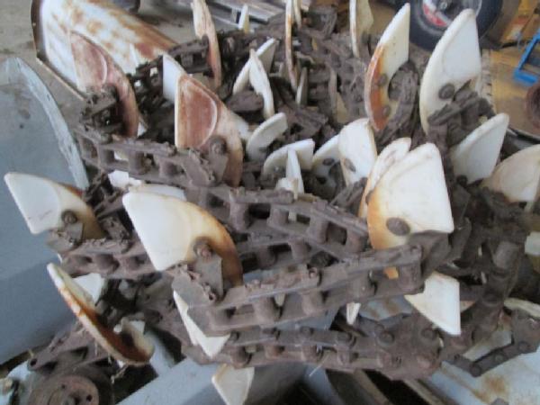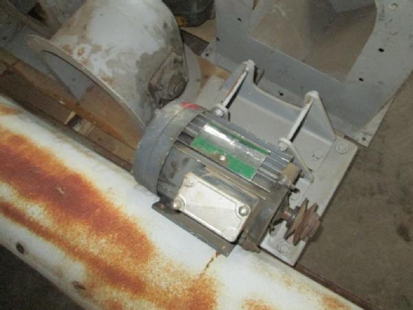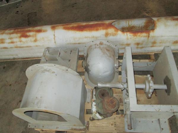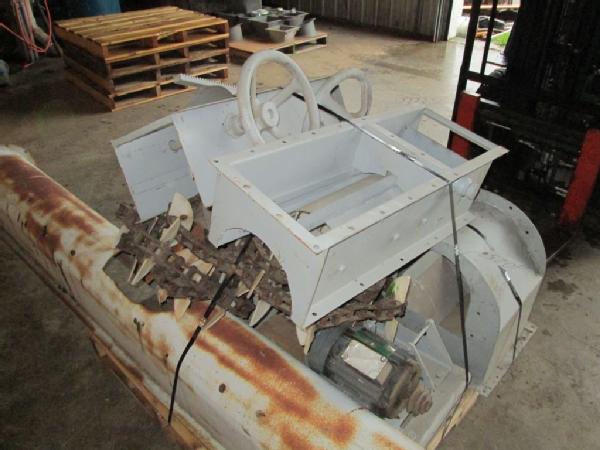 15' Super Flow Drag Conveyor (Item #025), 9" drag conveyor, complete with dodge shaft mount reducer and 2 discharge drops, 2HP 3 phase motor, 200/400 volts, unit has been sandblasted and primed and stored inside.