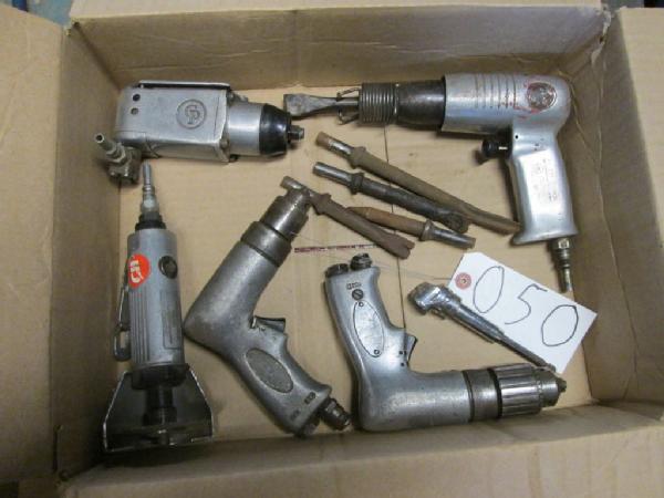 Misc. Pneumatic Tools (Item #050), air chisel, 3/8 impact wrech, die grinder, drills.