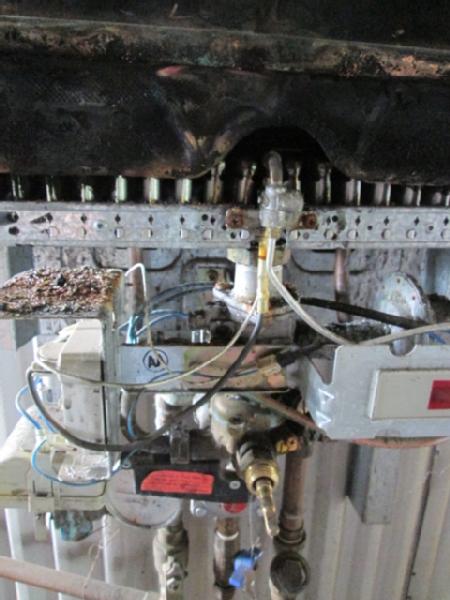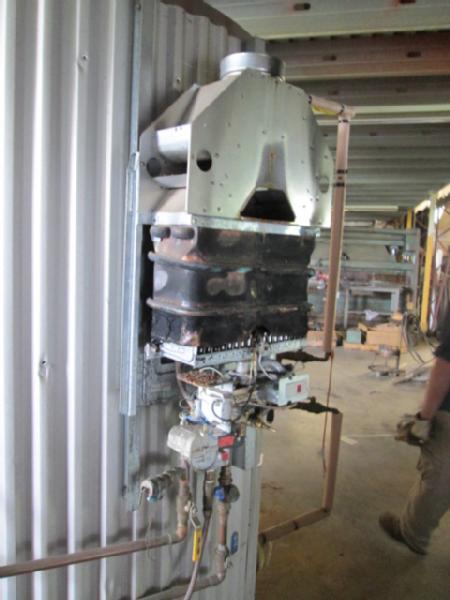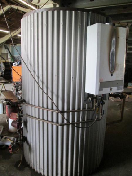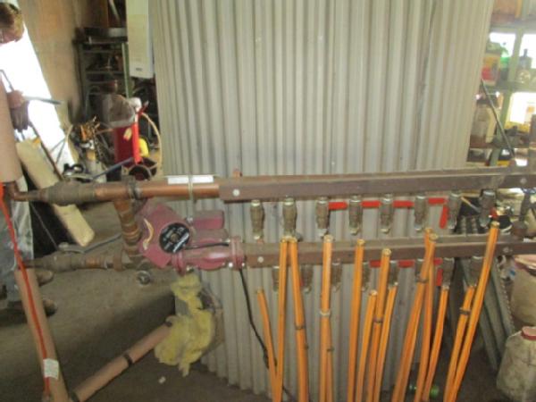 Hot Water Boiler for Shop (Item #103), was used for heating water in the floor of the shop, comes with manifold and pumps, used propane, burner needs work.