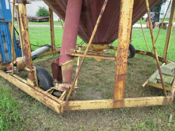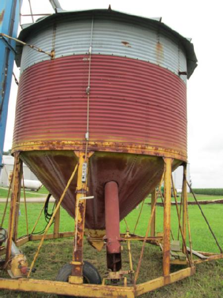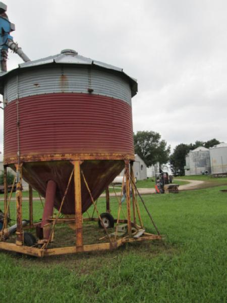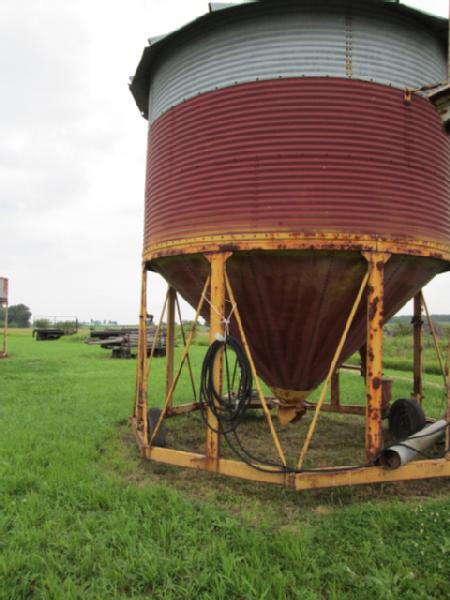 Hopper Bottom Bin (Item #108), 14' hopper bottom bin, 3 rings high with roof, 8" auger is built up the middle to fill it, auger is ran by hydraulics, bin is portable, has wheels for transporting, bucket elevator in picture DOES NOT SELL with this lot.