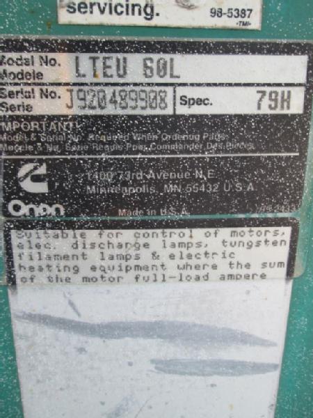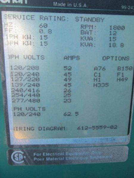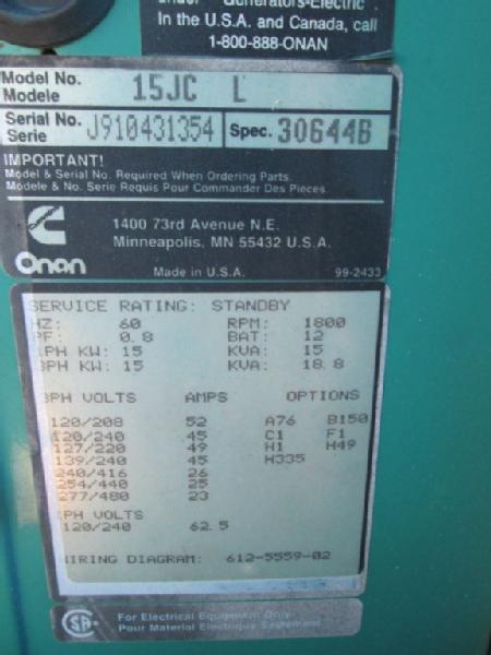 Cummins Onan Standby Generator (Item #124), Model 15JCL, Unit #2, Spec #30644B, single phase, 15KW, 1800 rpm on single or 3 phase, runs LP gas, 266 hours, with transfer switch, unit has been run and tested, it does generate power, has all weather enclose.