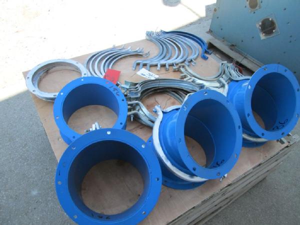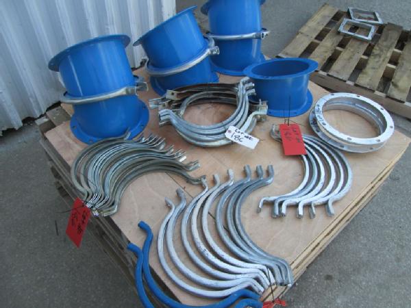 Pallet of Adjustable Elbows & Clamps (Item #186), (3) 10" adjustable elbows and (1) single elbow, (2) 10" flanges, (20) 10" pipe clamps, loose.